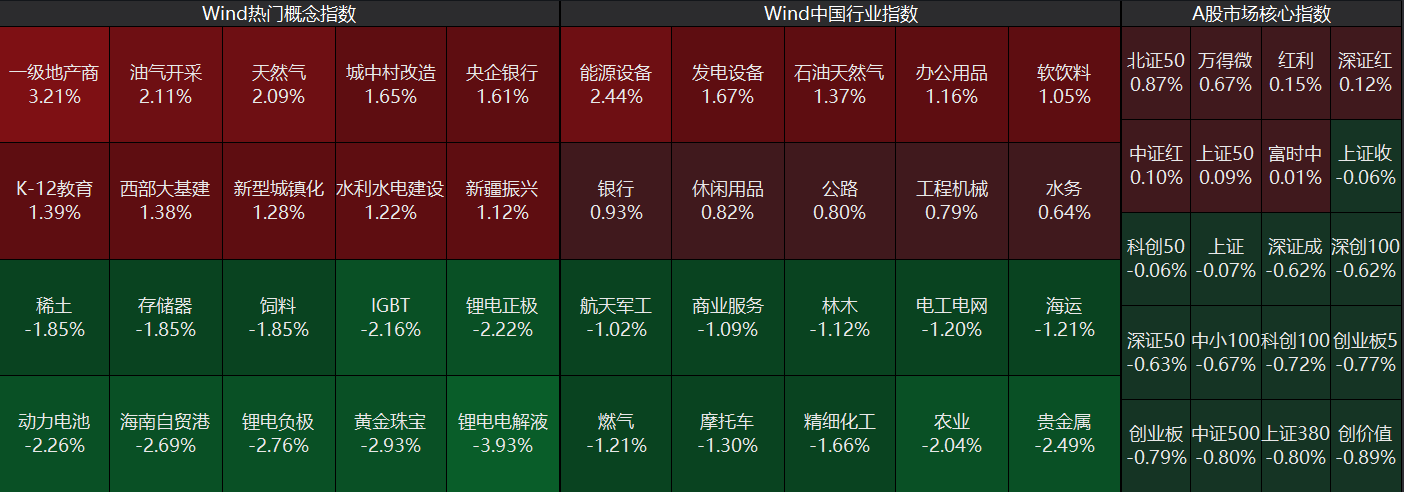 内需消费有所分化,房地产收涨0.69%,消费红利收跌0.68%。