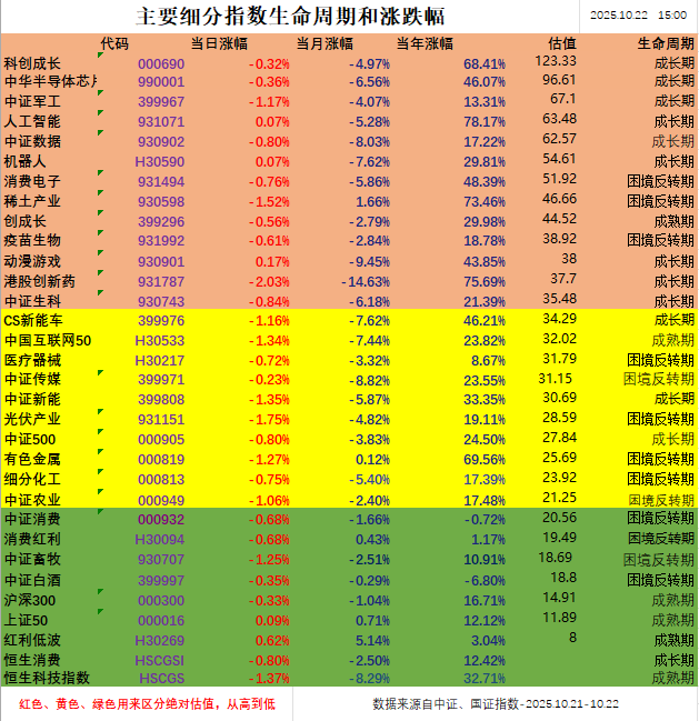 CS创新药下跌0.77%,SSH黄金股票下跌2.72%,稀土产业下跌1.52%,恒生科技下跌1.41%。(以上来源Wind,2025.10.22)