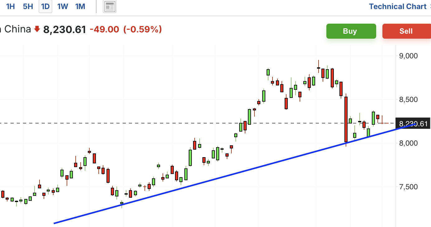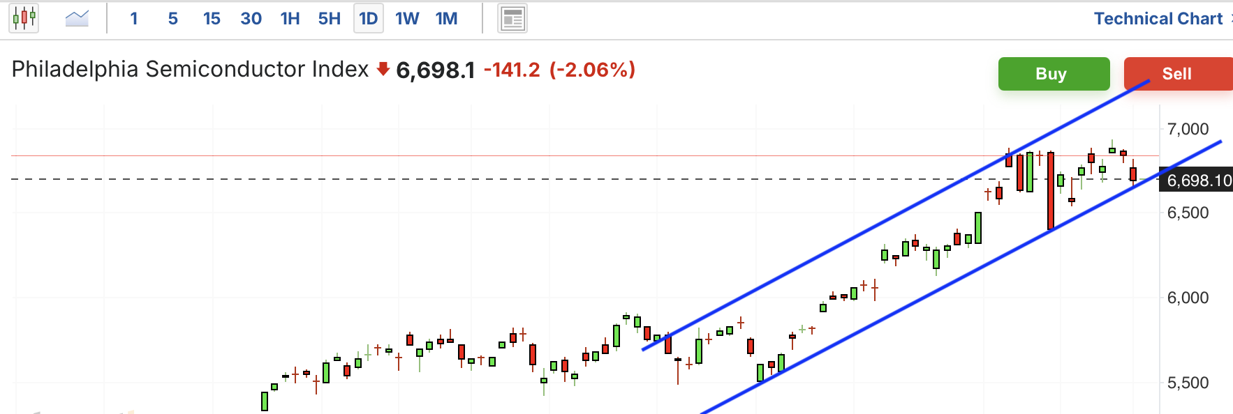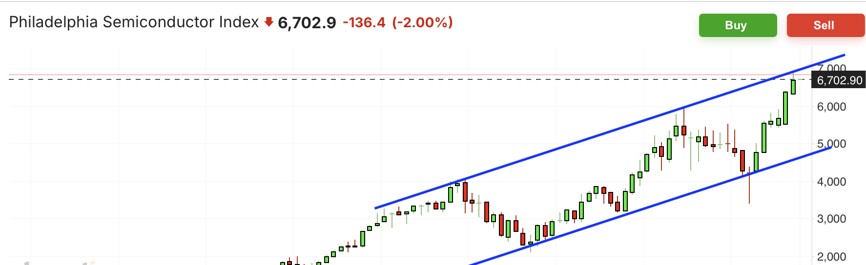 费城半导体近期趋势上行,最近在暴跌后反弹,后再次陷入盘整,这两日再次跌回支撑位,目前不确定能否守住,如果跌破,那么可能有短期回调行情。同时长期趋势也接近压力位。
