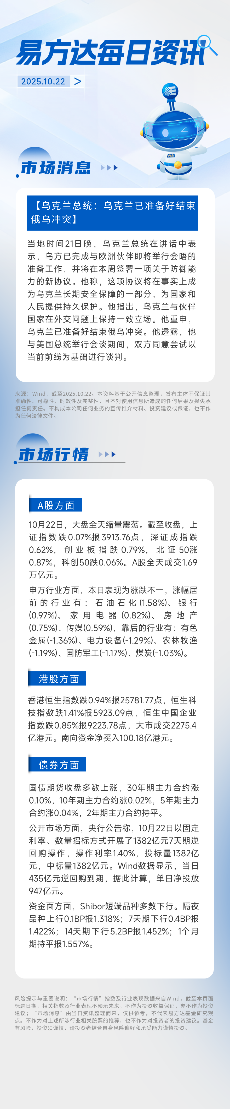 风险提示与重要说明:“市场行情”指数及行业表现数据来自Wind,截至本页面标题日期,相关指数及行业表现不预示未来,不作为投资收益保证,亦不作为投资建议;“市场消息”由当日资讯整理而来,仅供参考,不代表易方达基金研究观点。不作为对上述所涉行业相关股票的推荐,也不作为对投资者的投资建议。基金有风险,投资须谨慎,请投资者结合自身风险偏好和承受能力谨慎投资。