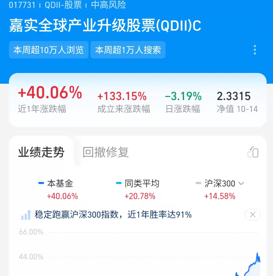$嘉实全球产业升级股票发起式(QDII)C$ 近一年涨了4006%,长期拿着稳稳的,不管行情起伏都能抗住。现在海外科技的风口正回来,Al、云计算还在发力,你们的科技跟上这波回暖了吗?