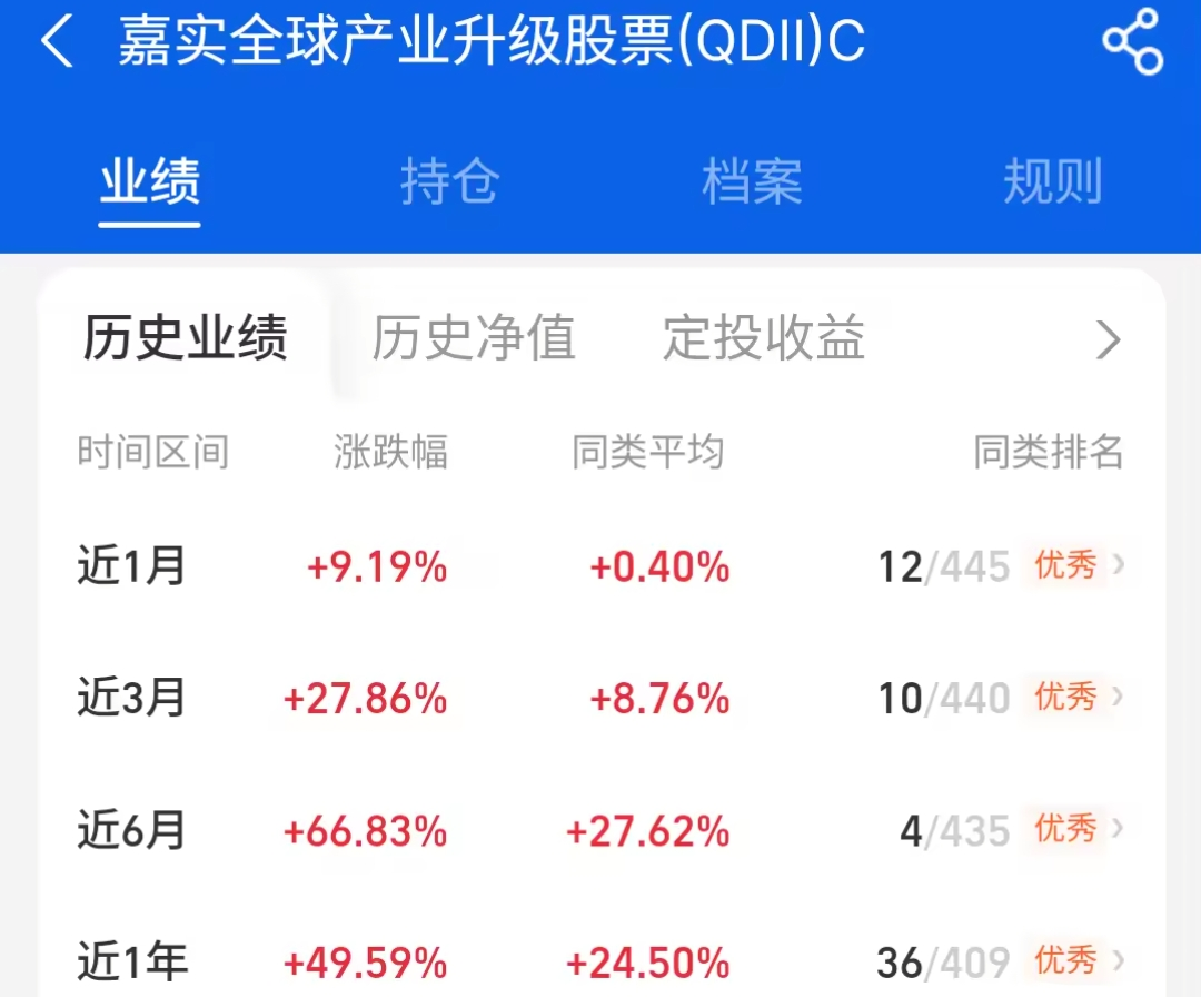 全球科技市场回暖信号太明显,AI、半导体这些赛道都动起来了,后市行情值得期待。$嘉实全球产业升级股票发起式(QDII)C$ 紧扣全球产业升级主线,布局够精准。近一年涨了49.59%,上周五行情里也稳涨0.24%,不管是行情发力还是震荡,都能跟上节奏。