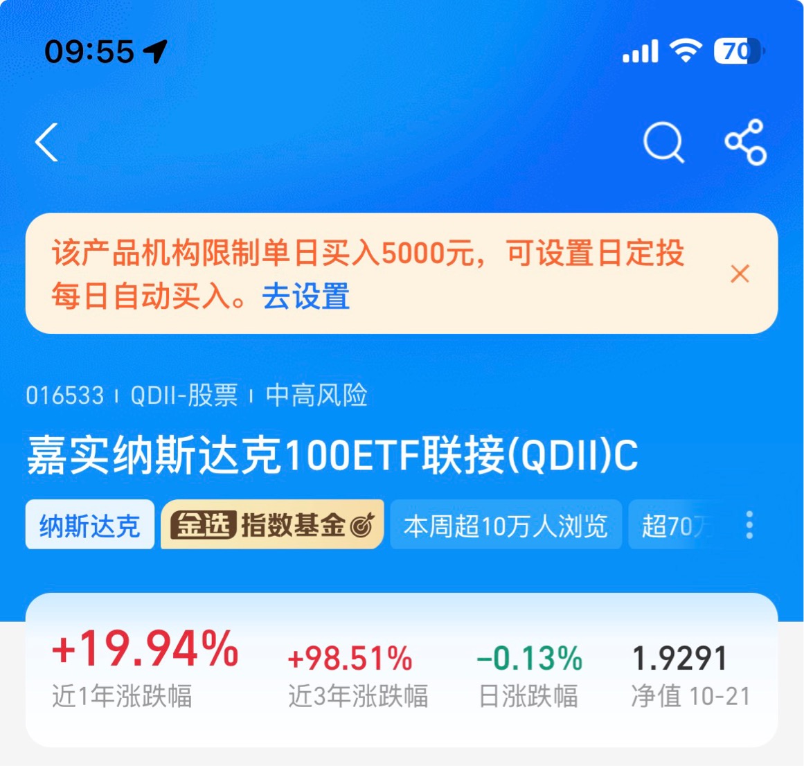 昨晚纳指收跌0.99%,终于给补仓的机会了呀,这支$嘉实纳斯达克100ETF联接