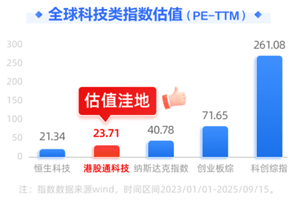 我们知道,美股科技从2023年就开始了新一轮牛市,表现强势,A股科技今年年内的涨幅也非常可观,估值都来到了偏高位置。而港股科技与全球主要科技指数相比,当下估值极具吸引力。