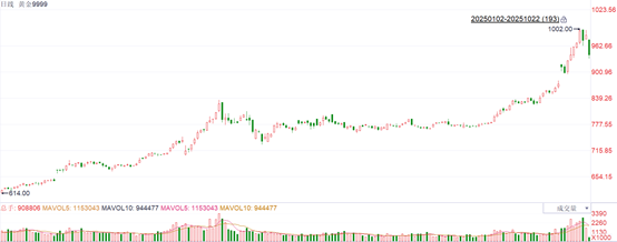 近日黄金价格出现回调,最直接的原因可能在于部分获利盘了结。以上海黄金交易所AU9999合约为例,其在10月20日成交量达到284万手,创下今年以来的第二高,仅次于4月22日的339万手(注2)。如此极端的成交量反映出多空双方分歧加剧,市场波动性随之放大。当买盘力量无法承接卖盘压力时,金价便出现阶段性回调。