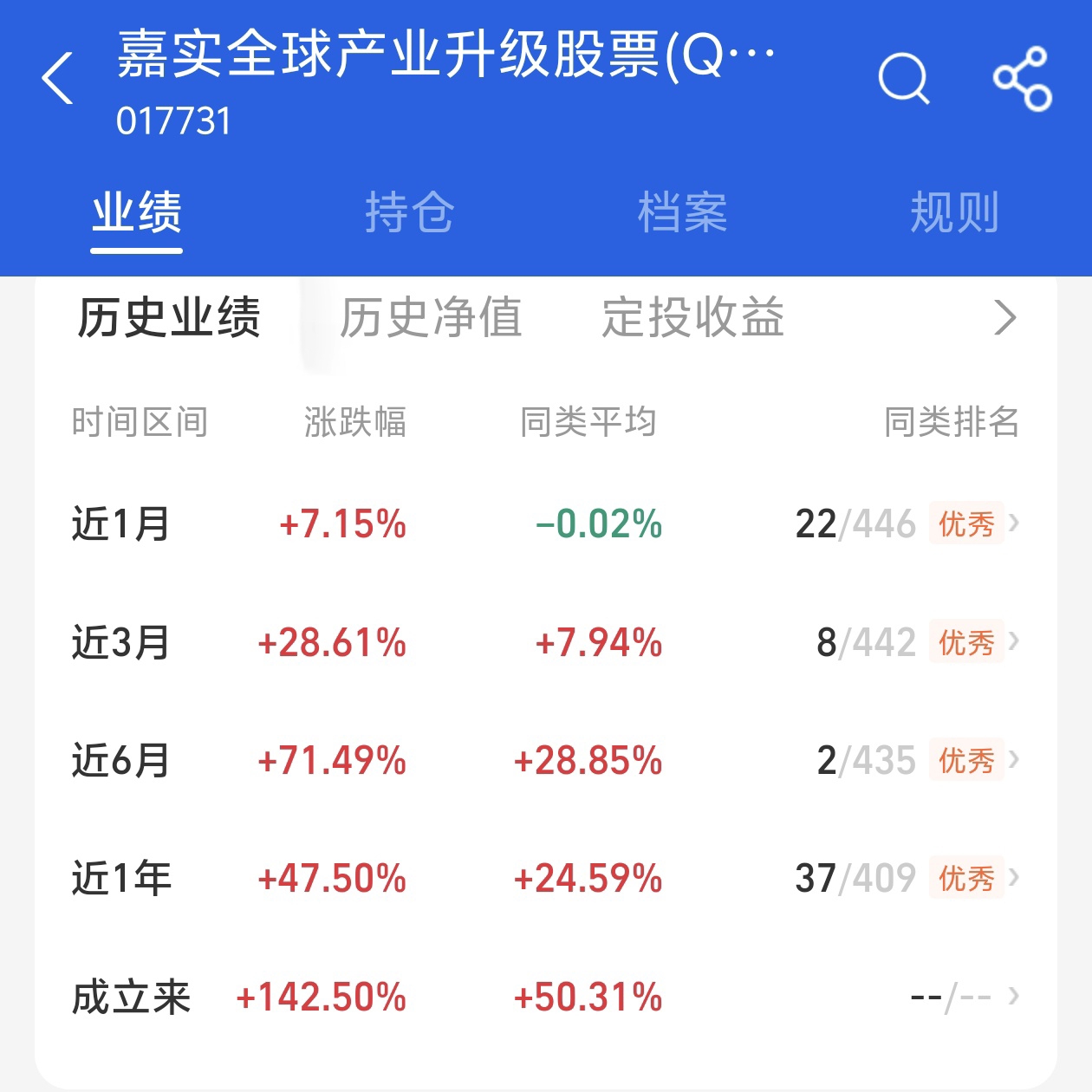 最近的行情也在一路上涨,表现的也是非常的不错,收益率高。$嘉实全球产业升级股票发