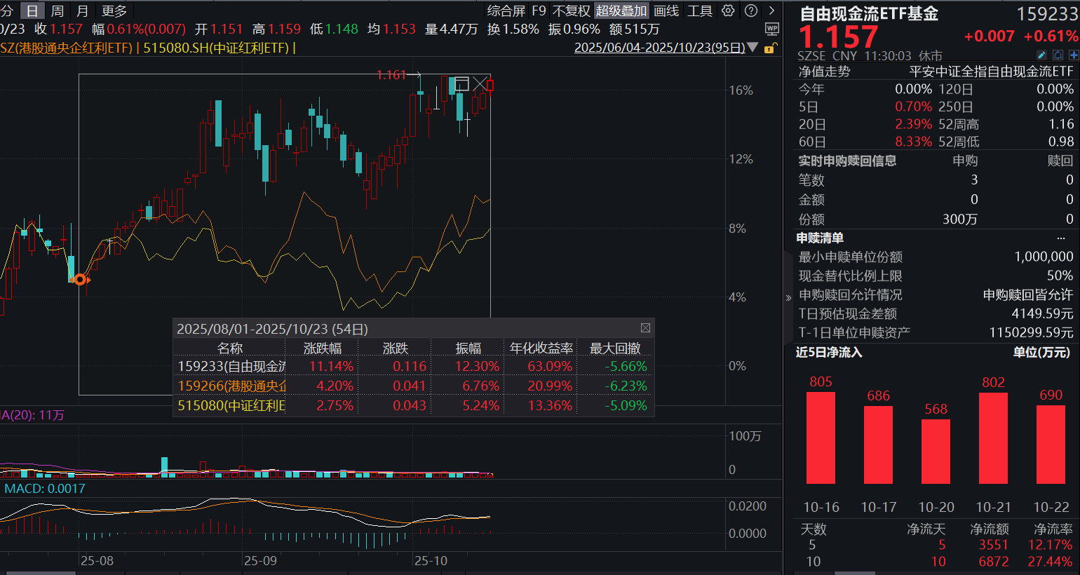 但这几类底仓型资产并不需要过多的区分和挑选,可以组合去搭配,像我7月份说的,如果你看好周期觉得银行高了,那就多配点自由现金流。$159233 $159266 (现金流159223、港股通央企红利159266)
