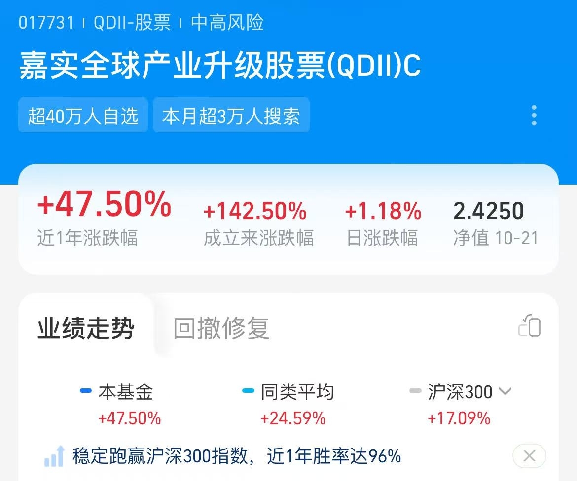 股市近期难免有些震荡,走势起起落落的,但其实市场波动本就是常态,不用太焦虑。我一直有关注的嘉实全球产业升级股票(QDII)C 表现就挺让人安心,近一年涨了47.50%,成立以来的收益率更是达到142.50%,这样的长期业绩很亮眼,作为全球配置的标的确实不错。