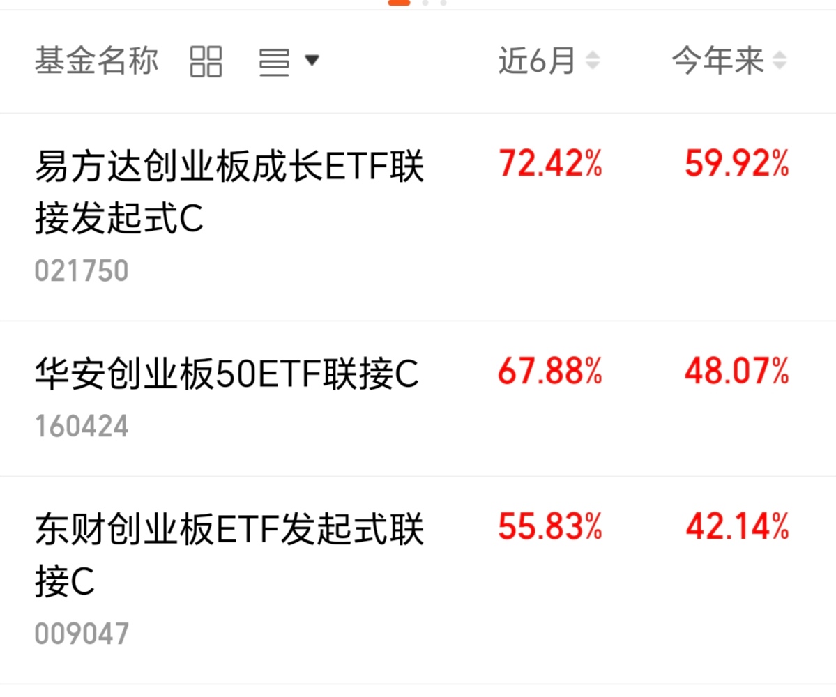 $东财创业板ETF发起式联接C(OTCFUND|009047)$$华宝创业板人工智能ETF发起式联接C(OTCFUND|023408)$$广发创业板ETF发起式联接C(OTCFUND|003766)$$交银创业板50指数C(OTCFUND|007465)$$易方达创业板ETF联接A(OTCFUND|110026)$$天弘创业板ETF联接C(OTCFUND|001593)$