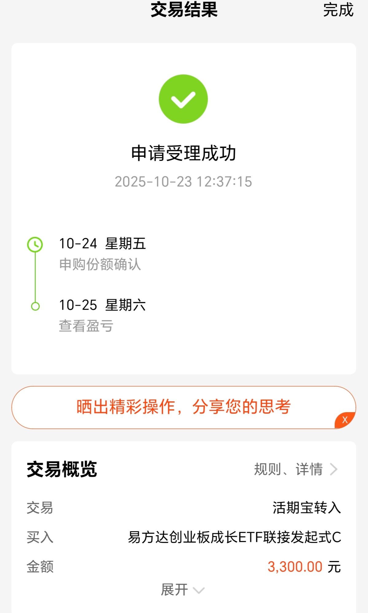 今日大盘行情再次震荡回调,创业板也紧跟调整,不过在这波牛市行情中,下跌反而也是加仓机会,而创业板成长明显聚焦高成长公司,整体业绩优于创业板,所以我选择果断定投$易方达创业板成长ETF联接发起式C(OTCFUND|021750)$其持仓的宁德时代三季度业绩远超预期,从而推动创业板整体上涨,近6月涨幅更是超72.42%,我也准备抓住这波成长主线回调机会,期待接下来的反弹力量!