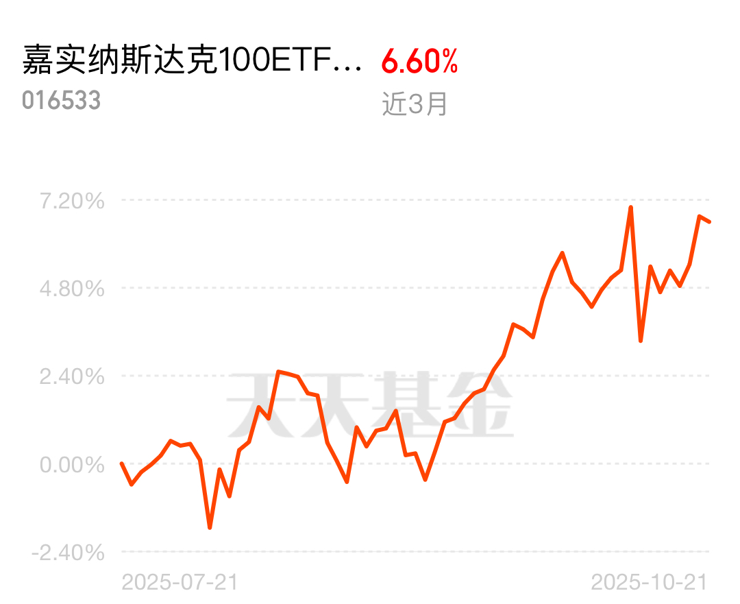 我在#高盛看多A股:慢牛正形成 还有约30%上涨空间# 选择了“算力概念” 大A股一震荡,那就是看美股了,现在美股ke'ji已经进入财报披露季,现在这个$嘉实纳斯达克100ETF发起联接(QDII)C人民币$ 是目前额度最高的单品了,单日5000元,既然10月份还要降息,那现在提前布局一些美股也是有必要的,还有空间,今天跟一些比较合适!