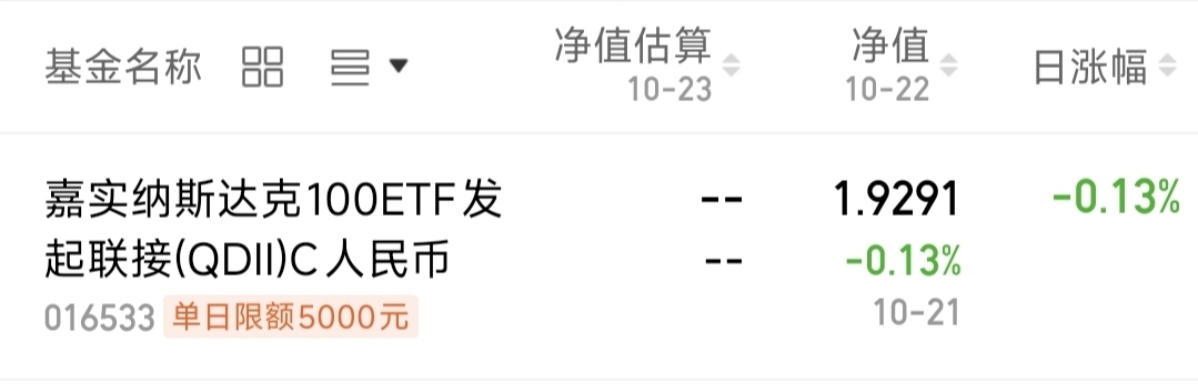 #15连阳!农行总市值逼近2.9万亿# 现在行情不管是A股还是美股,每天玩的就是刺激两字,不过对于美股来说问题不大,还好手上的$嘉实纳斯达克100ETF发起联接(QDII)C人民币$ 这只额度有5000,是现在全市场额度最高的单品。 10月28-29日美联储议息会议降息信号明确,流动性宽松有望推动美股续涨。这只基金精准跟踪纳斯达克100指数,年化跟踪误差仅2.01%低于同类 ,当前额度充足,正是布局良机。