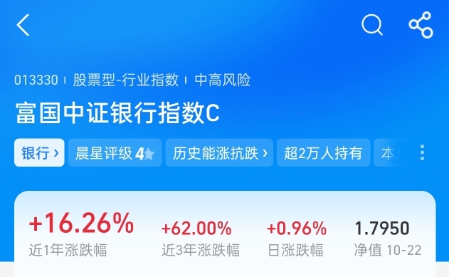 $富国中证银行指数C$ 挺不错的,它跟踪中证银行指数,涵盖招商银行、工商银行等龙头,覆盖综合与区域性银行,成分扎实。业绩可圈可点,近一年收益率达16.26%,能较好反映银行板块整体表现。在当前市场风格下,它既分享板块稳健红利,又降低个股选择难度,所以今天先布局上车了,计划长期持有。