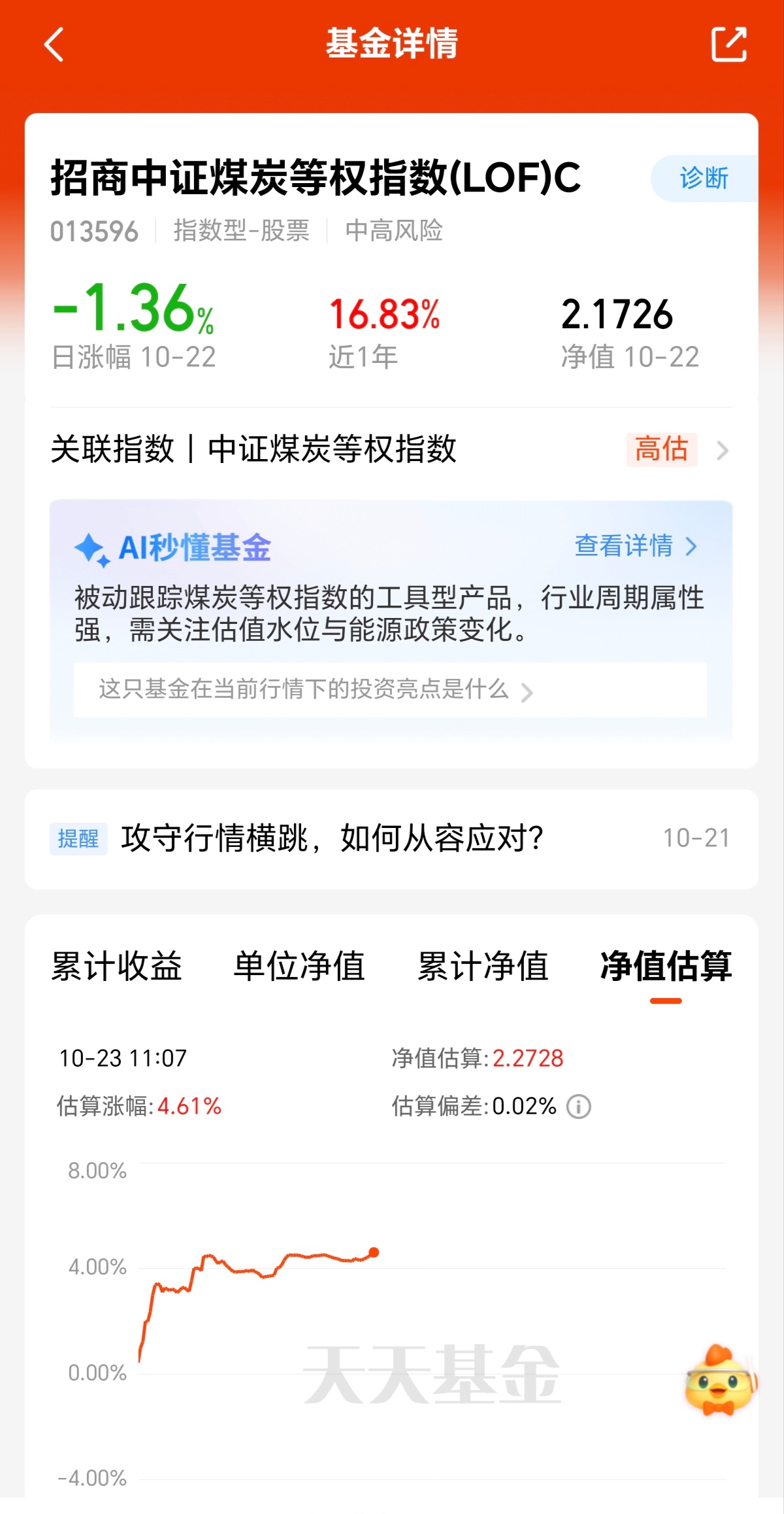 今日煤炭板块延续强势上涨趋势,整体表现颇为亮眼!其中我看好的$招商中证煤炭等权指数(LOF)C(OTCFUND|013596)$目前实时估值更是大涨4.61%,近一个月涨幅11.83%,收益率远超同类平均,业绩排名优秀靠前,而现阶段煤炭供应偏紧,冷冬预期叠加政策稳价,我觉得在第四季度里,煤炭板块将会有新一波的上涨动力,所以果断定投上车一波!
