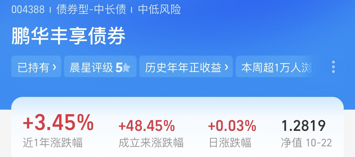 经过对这一段时间的行情分析我发现,利率债跌宕起伏的,一天涨一天跌,波动较大。信用债反而更稳健一些。鹏华丰享债券也是一只老将债基了,成立时间长而且历史年年正收益。它主要投资信用债,同时配置了22%+利率债博弈收益。上个季度我也是加仓了好几轮了,前段时间债市风雨较大,它也陪着我经历了,而且回调较少。从小长假到现在才碎蛋一天,昨天还收了3个蛋。节后信用债已经有企稳回暖的迹象了,我今天打算继续补仓1000元,作为长久持有的底仓去配置!