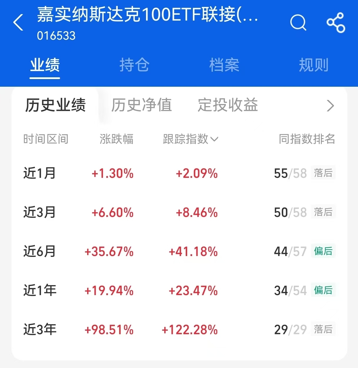 现在A股行情震荡,美股近期表现稳健,波动幅度不大。截至目前纳斯达克期货小涨。尽管短期可能面临阶段性调整,但长期趋势未变,我认为纳斯达克还是有一定的性价比。$嘉实纳斯达克100ETF联接(QDII)C$ 跟着纳斯达克100指数走,C类没申购费,满7天就能赎回,单日最高5000元;也是QDII基金里开放额度最高的,长期表现抗跌,近6个月涨了35.67%,近12个月涨了19.94%。