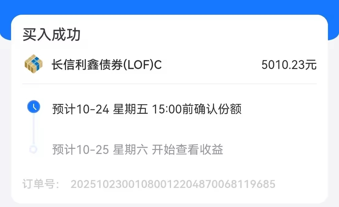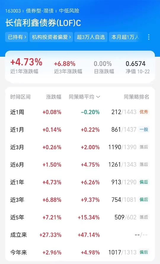 我因为怕权益的高波动,所以在周一、二大涨后进行了减仓,现在看来是正确的。但又不想错过权益与纯债跷跷板效应导致的此增彼长挣扎,所以我选择了$长信利鑫债券(LOF)C$ 这个低波固收+品种进行持有,我目前持仓为3.1W,收益曲线稳步向上,规模为10.25亿,机构持有占比96.66%,A份额规模为11.44亿,机构持有占比99.28%,两个份额的机构持有比例都高达9成以上,这在低波固收+中不多见,说明机构大佬们也是对风险与安全性有更多的考量的。从资产配置角度来看,信用债占76.92%,利率债占14.28%,这两者提供了稳定的票息来源,利用11.56%的可转债进增厚收益,近一收蛋8个,相当亮眼,近6个交易日中长信利鑫都没有丢蛋,也说明回撤控制不错。近1个月最大回撤只有8个蛋,4天修复,长期持有,业绩不错:近一年收473个蛋,主要是看中它的稳健,波动小,长期拿着就不发愁。今天趋行权益行情合适继续发车5010.23元。