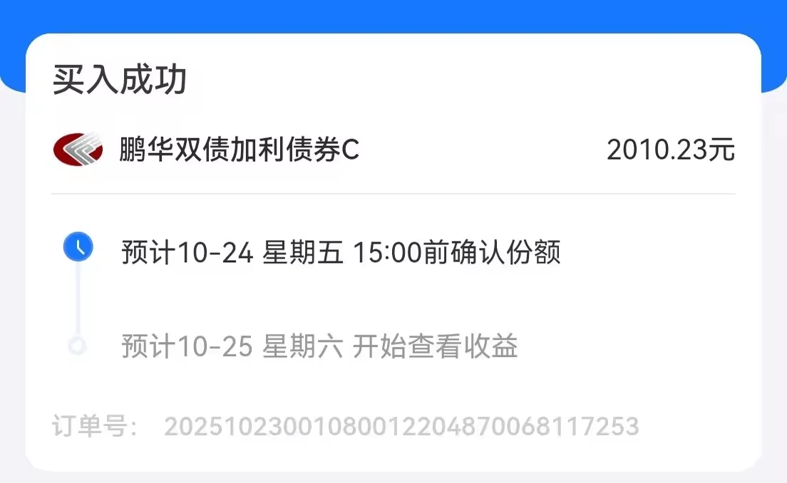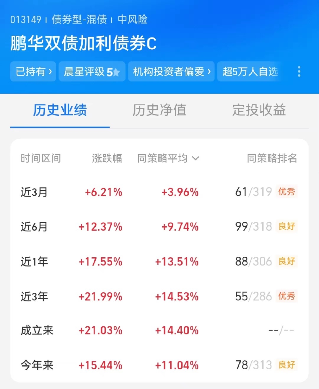 我对$鹏华双债加利债券C$ 的关注已有一个月,目前持有近8K。进入10月之后,市场震荡比9月还大,但鹏华双债加利仍始终呈现震荡向上的态势,前天还大赚了72个蛋,近3个月累计收蛋达621个,表现远优于纯债基金。在资产布局方面:转债占比42.75%(负责贡献收益弹性,捕捉债市、股市的双重机会),股票占比19.86%(少量布局优质股,增厚收益),信用债+利率债合计占比超48%(作为底仓,托住净值,降低波动);从规模与机构持仓来看,鹏华双债加利C份额规模9.55亿元,机构持有比例90.78%;A份额规模31.98亿元,机构持有比例95.42%。两类份额合计规模超40亿元,充足的规模为投资提供了较强的安全性;叠加机构高比例持有,恰好契合我过往"跟着机构大佬走,方向不会错"的投资逻辑,因此在这类标的上,我更愿意顺势布局。业绩表现上,鹏华双债加利近3个月涨幅6.21%、近半年12.37%、近一年17.55%,"稳健"二字名副其实,也难怪平台评价其"策略稳定性较强"。基于对上述优势的认可,今日我对鹏华双债加利大额加仓2010.23元。
