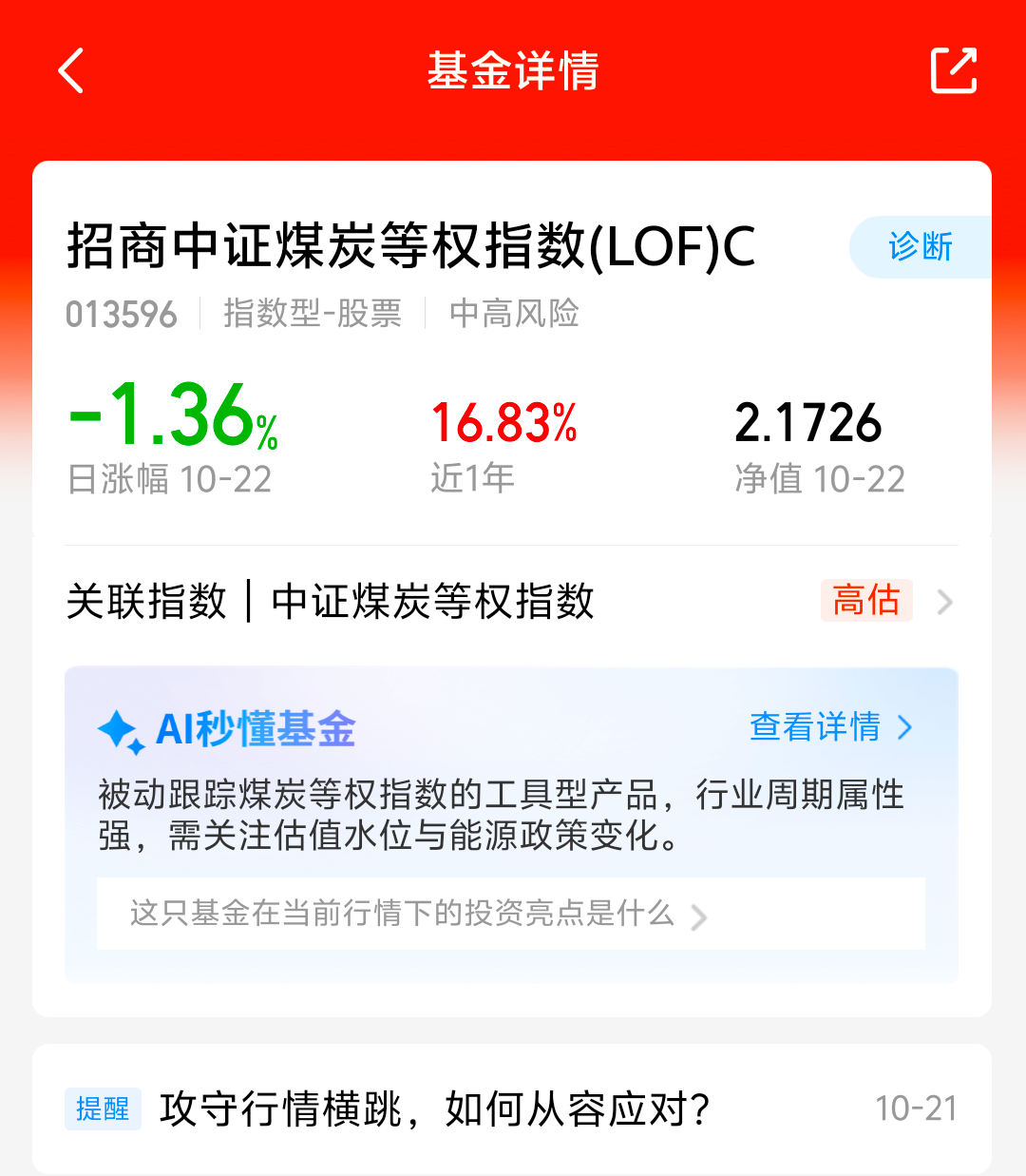 大盘今天震荡回调,煤炭今天逆市大涨,煤炭板块近期表现还不错呢,$招商中证煤炭等权指数(LOF)C(OTCFUND|013596)$目前预估涨幅4.63%,近一周涨了5.22%,近一月涨了11.83%,最近涨了不少,四季度又到了煤炭周期了,看好这个方向,我准备分批加仓一波,期待它能给我带来不错的收益!