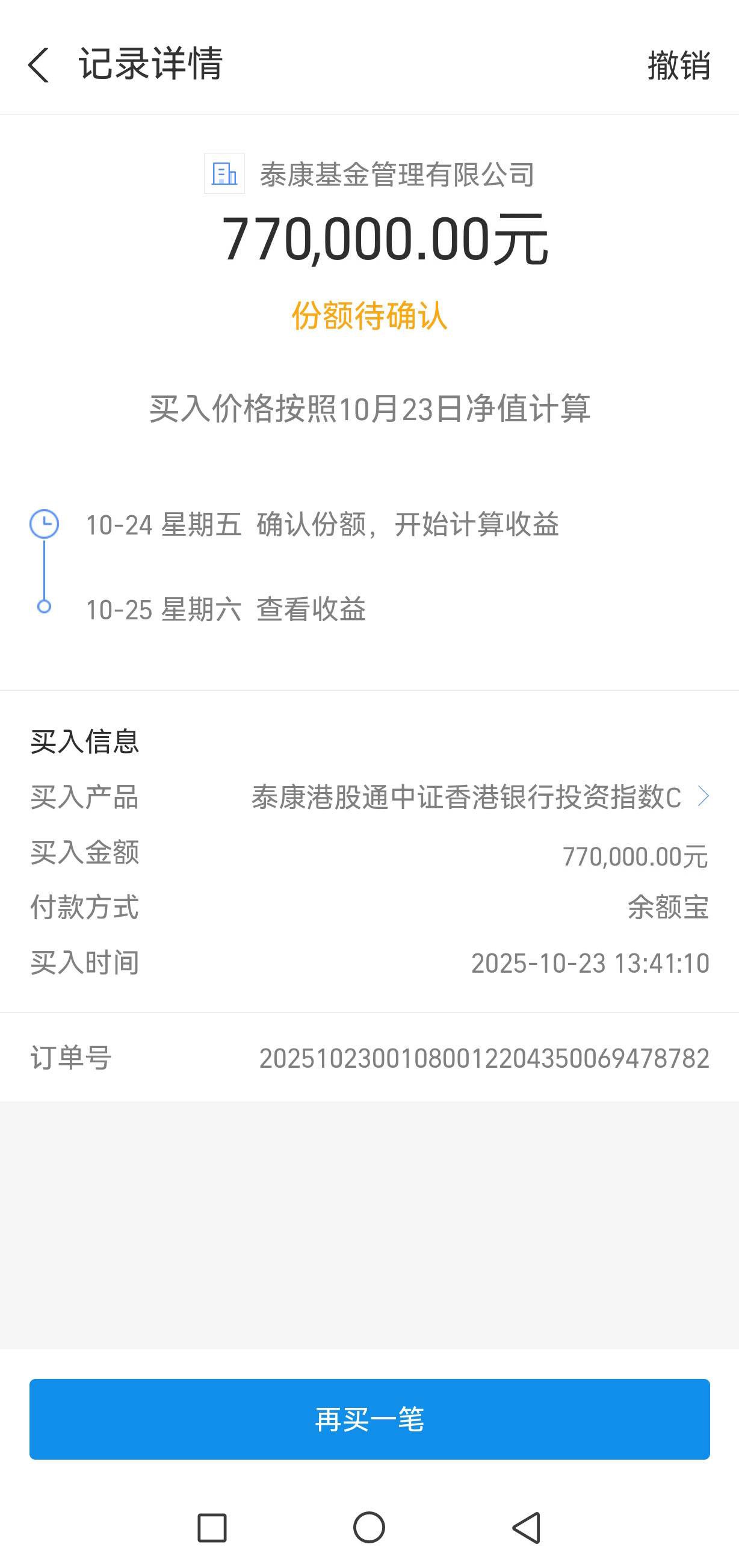股市维持来回震荡态势,多空博弈激烈,市场风险偏好持续低迷,科技板块跌势明显,今天决定把方向转向防御。能看出现在资金风险偏好降低,都在往稳健板块抱团,比如农业银行就又创了历史新高。今天梭哈770000元,$泰康香港银行指数C$ 这只基金紧密跟踪中证香港银行投资指数,业绩比较实在,近半年涨16.4%,近一年涨33.97%。