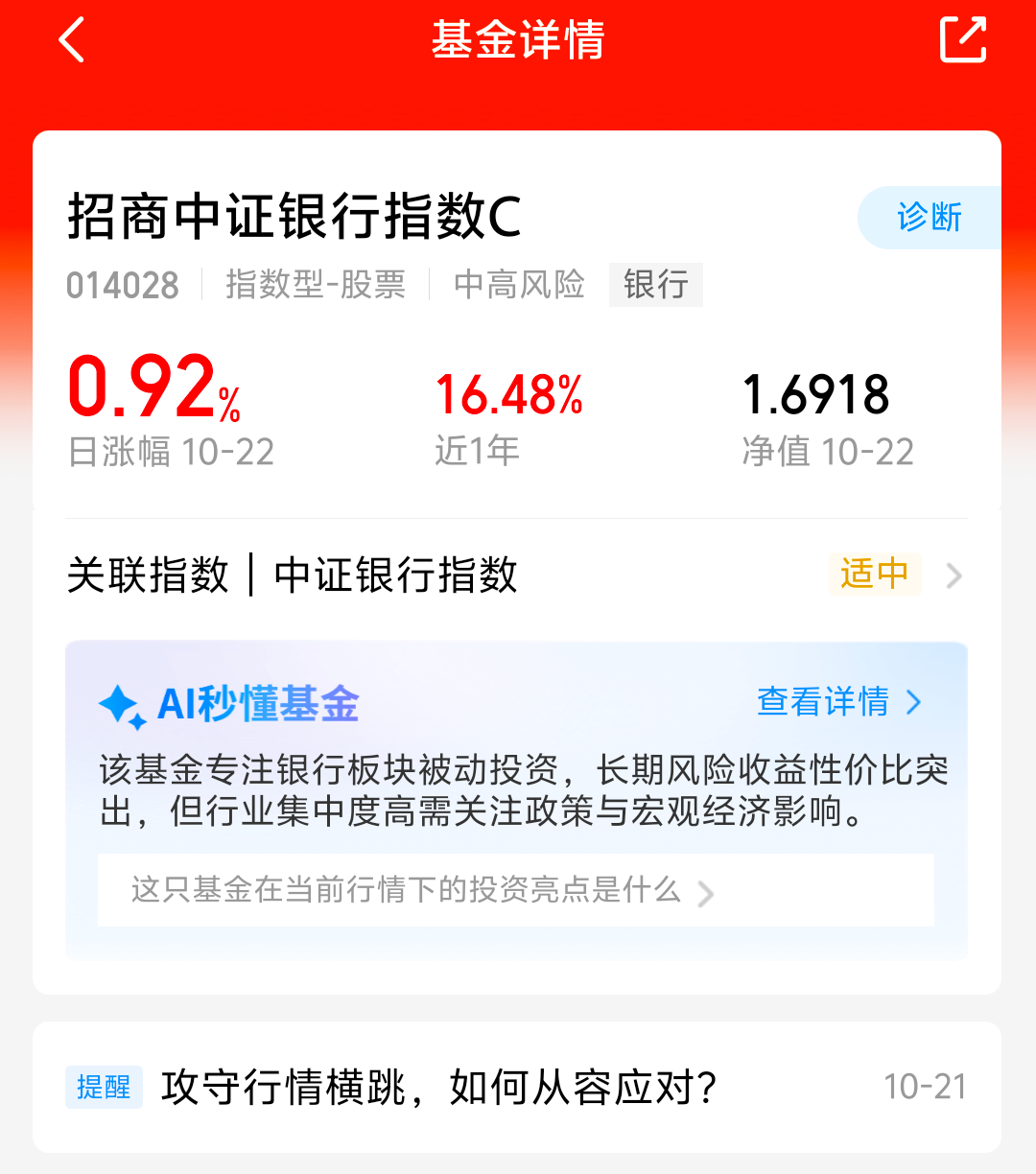 大盘今天震荡调整,大科技等板块回调,银行板块今天逆势上涨,避险属性升温,农业银行持续上涨,创了历史新高,$招商中证银行指数C(OTCFUND|014028)$近一周涨了2.20%,近一年涨了16.48%,业绩还不错,作为持仓中的压仓石很不错,看好这个方向,我准备分批加仓了!