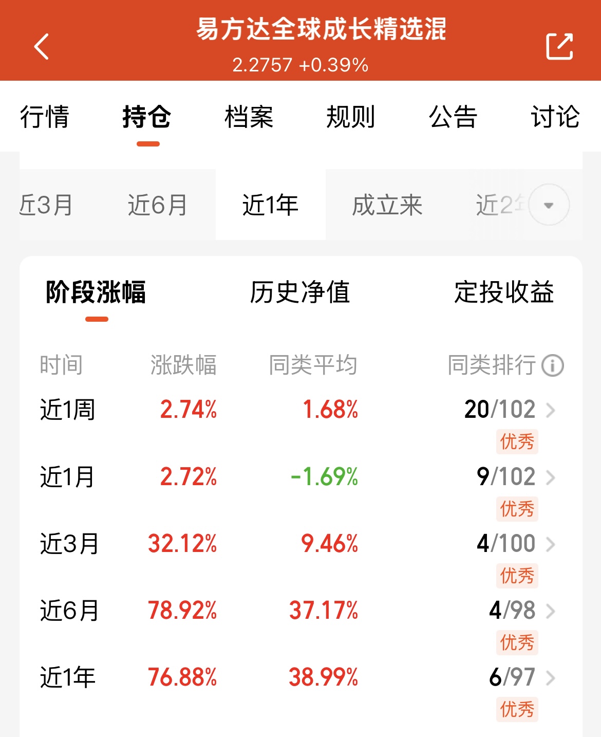 今天大盘继续调整了,盘面绿油油的,科技方向也是回调的比较多,例如机器人今天也是吃面,所以单一的市场还是比较难的,易方达全球成长精选混合(QDII)人民币C是聚焦A、美和港股三地市场,这样既能分散风险,还能提高收益,近一年收益率76.88%,业绩也是不错的,主要是科技方向为主的,我觉得科技还是重要的前景方向,我继续看好的!