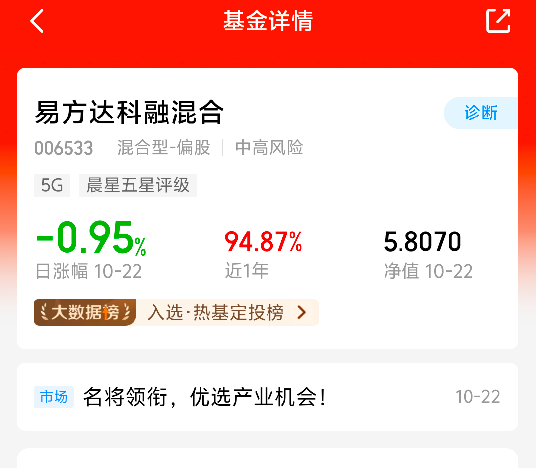 大盘今天震荡调整,科技板块今天回调了,最近市场波动比较大,各大板块轮动速度很快,易方达科融混合持仓科技、新能源、军工等板块,轮动配置,近期这种行情下均衡配置可以有效的分散风险,东边不亮西边亮,易方达科融混合近六个月涨了102%,业绩不错,我准备分批加仓了!