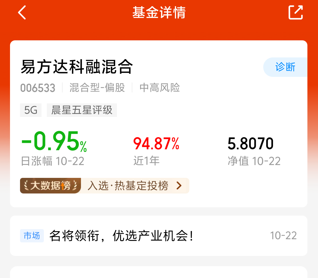 大盘今天震荡调整,三大指数震荡回落,大科技板块今天跌下来了,近期市场波动加剧,各大板块轮动也很快,易方达科融混合持仓科技、新能源和军工等板块,轮动配置,经理调仓能力不错,这只近六个月涨了102%,我准备分批加仓一波了!