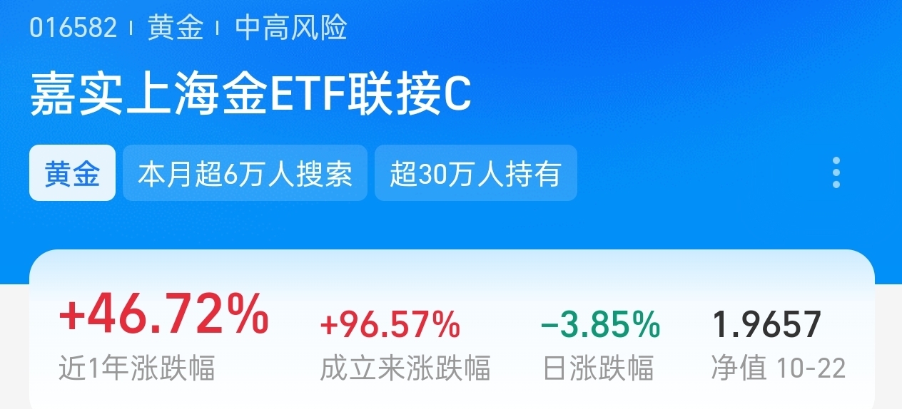 今天布局了$嘉实上海金ETF联接C$ ,它就很合适,近一年收益率达46.72%,能较好把握金价波动机会。而且它持有7天免赎回费,流动性灵活,费率也低,即便后续有变动也方便调整。当前美联储降息预期抬升,叠加全球央行购金等长期支撑,此时布局能更从容地把握黄金的配置价值。