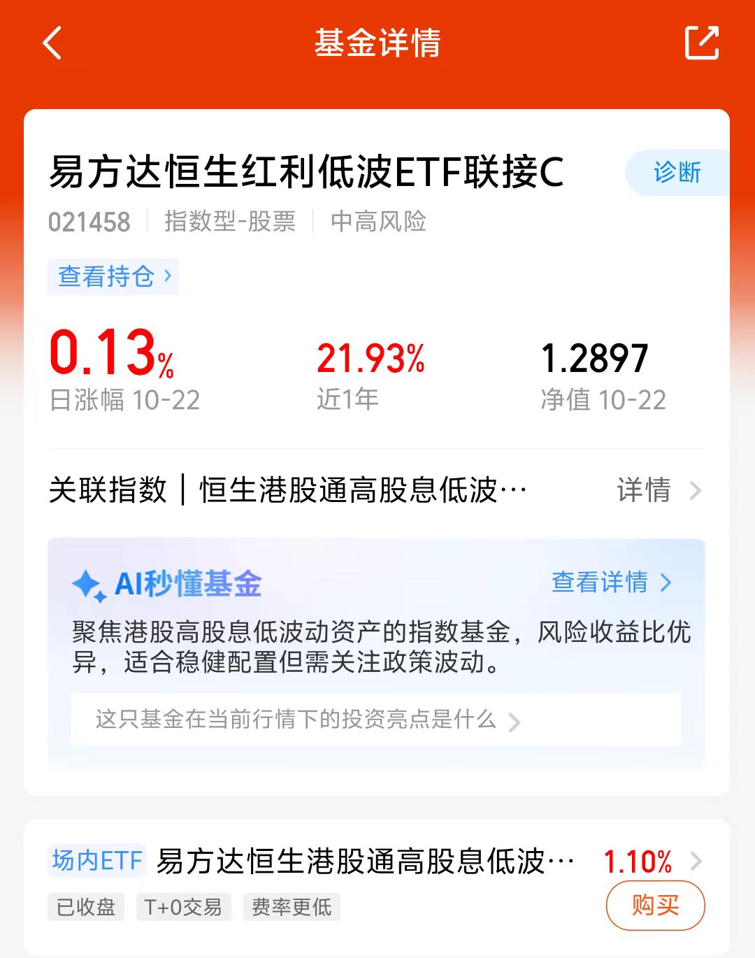 大盘和港股震荡调整,红利板块逆市上涨,港红利今天涨了不少,近期市场波动比较大,红利板块防御性不错,市场风格切换,最近我还是打算稳一些,继续加仓易方达恒生红利低波联接C,美联储降息背景下,港股红利比A股红利弹性大,近一年涨了21.93%,看好这个方向,我打算分批加仓了!