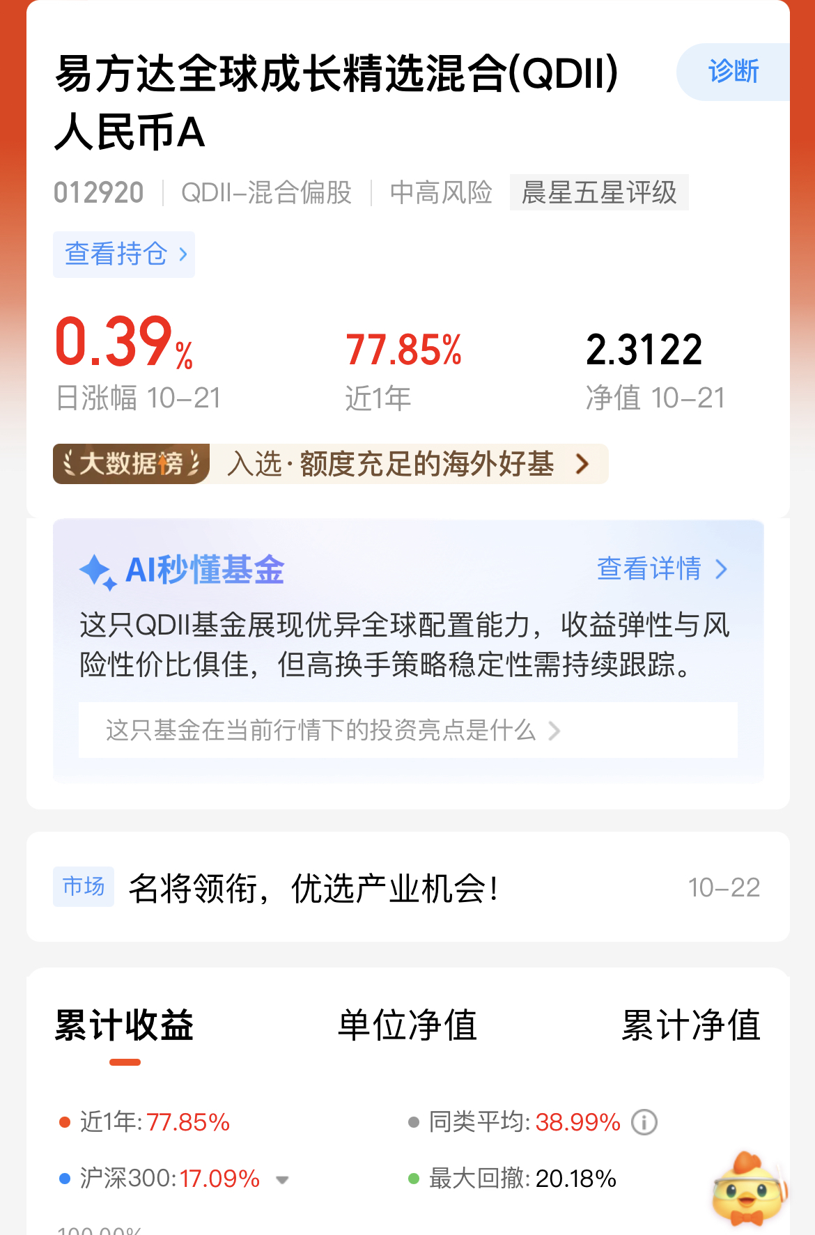 美联储降息的风一吹,全球科技资产都在蓄力。单押一个市场太冒险,$易方达全球成长精选混合(QDII)人民币A(OTCFUND|012920)$就很合适。覆盖美股机器人、港股互联网、A股算力,把热门科技赛道都攥手里了。它近半年涨了79.34%,涨得多还能控回撤,现在市场分歧大,配点这种跨市场科技基,既能攻又能稳,跟着基金经理安心吃肉啦!