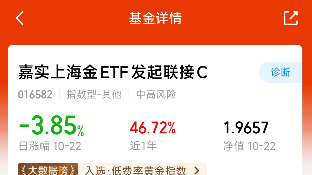$嘉实上海金ETF发起联接C$ 跟踪金价走势,近一年上涨超17个点,当前这一系列的消息都是利好黄金这一消息面的呢,长期来看黄金感觉还有有继续上涨的空间。等待后面继续新高吧!