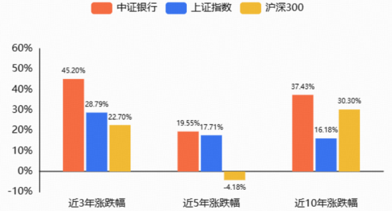另外,从长期表现上看,银行指数长期收益跑赢大盘。以中证银行指数(399986.SZ)为例,从近3年、近5年、近10年表现来看,中证银行指数均跑赢上证指数和沪深300指数,长期投资价值较高。