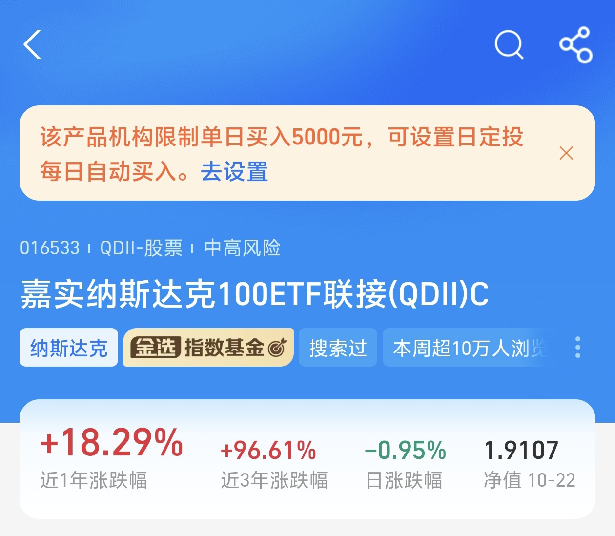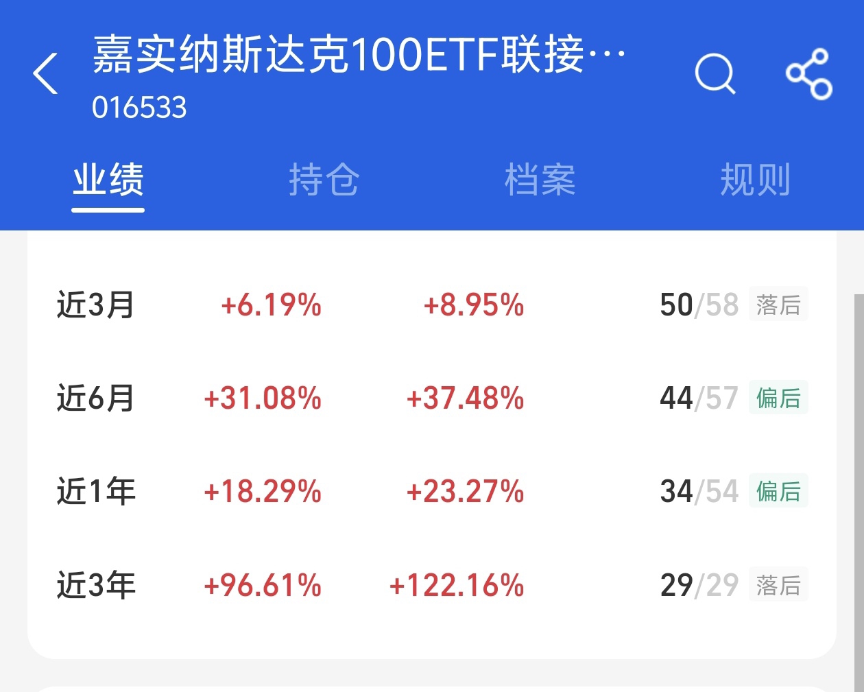 $嘉实纳斯达克100ETF发起联接(QDII)C人民币$ 基金表现的也是非常的优秀!近三个月上涨了6.19%,近6个月上涨了31.08%,盈利能力强,基金精准的跟踪纳斯达克100指数上涨弹性大,爆发力强。随着科技企业在技术创新和业务拓展方面不断增长,盈利能力逐步的提升,将推动指数进一步上涨。最让我放心的是,纳斯达克100指数采取修正市值加权的计算方式,具有动态调整的特性。长期持有,投资回报率高,期待后期收益。