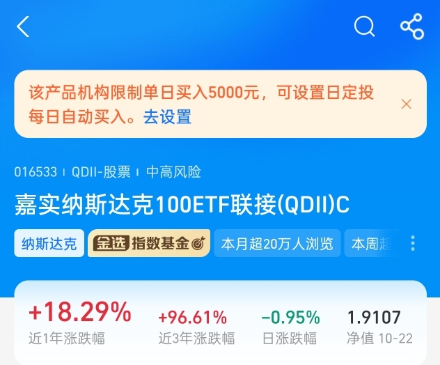 我留意到$嘉实纳斯达克100ETF联接( QDI)CS,它的核心目标就是紧密跟踪纳斯达克100指数,持仓里直接包含微软、英伟达这些全球科技巨头。一键布局了美股核心资产,不用自己逐个筛选个股,省了不少事。而且它赛道很聚焦,指数成分股多在人工智能、云计算等高成长领域,这些行业正加速技术创新,长期潜力足,更关键的是它目前额度最高,单日能买5000元,整体看挺合适的。