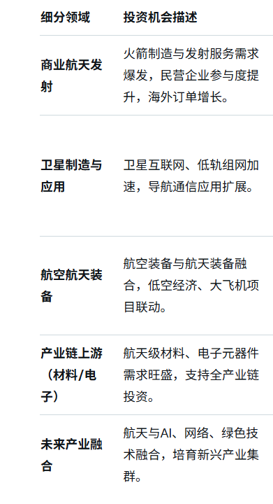 细分领域上分别有商业航天发射、卫星制造与应用、航空航天装备、产业链上游(材料/电子)、未来产业融合。