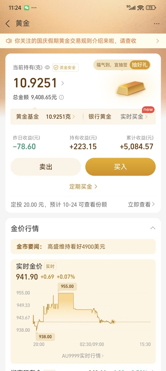 早盘黄金高开低走,午盘估值继续拉升,目前为止估值又开始涨了,金价941.90,估值涨幅0.07%,这几天回调幅度大,位置很低了,长期看央行购金赠持,地缘政治风险加剧,都利好黄金,今天继续低吸上车$嘉实上海金ETF发起联接C$ 持仓等待回暖吃肉了