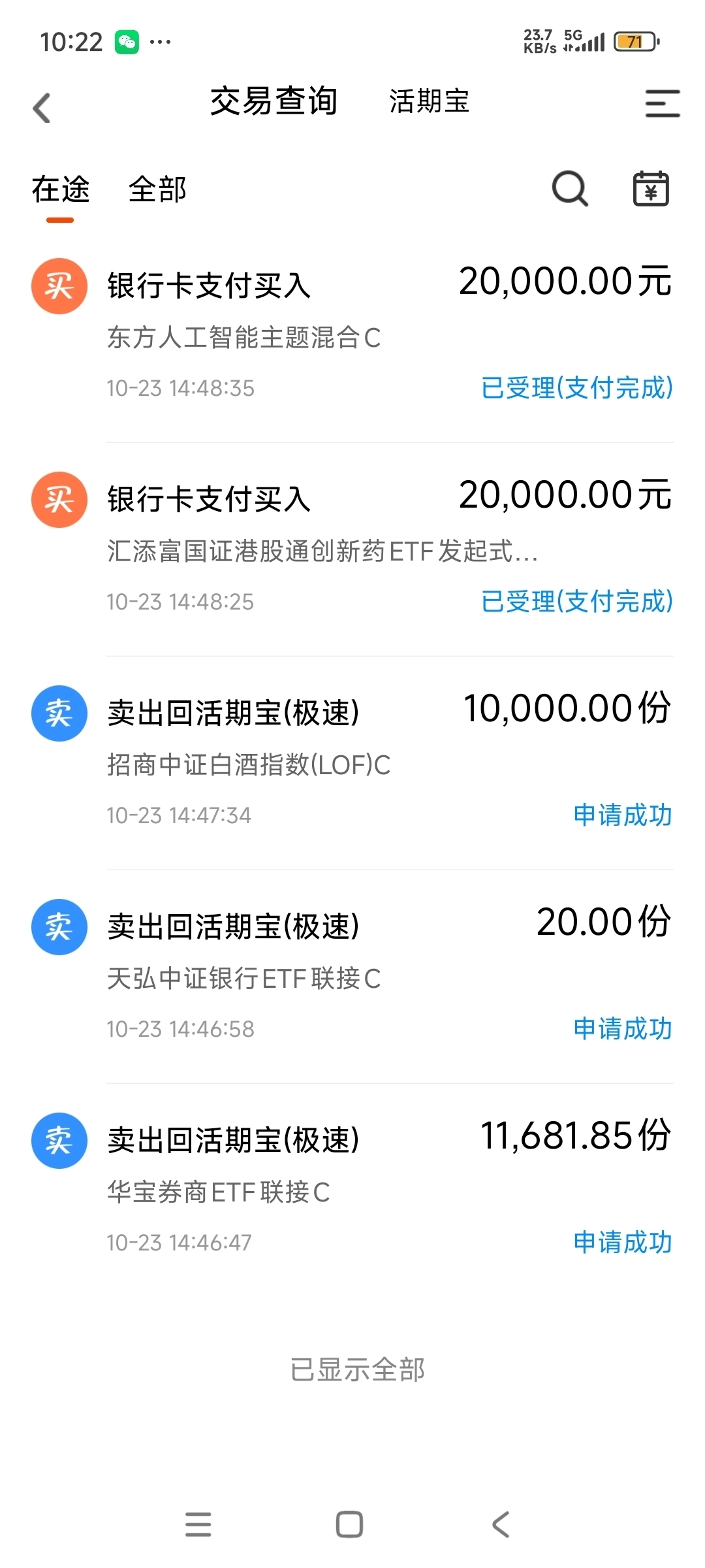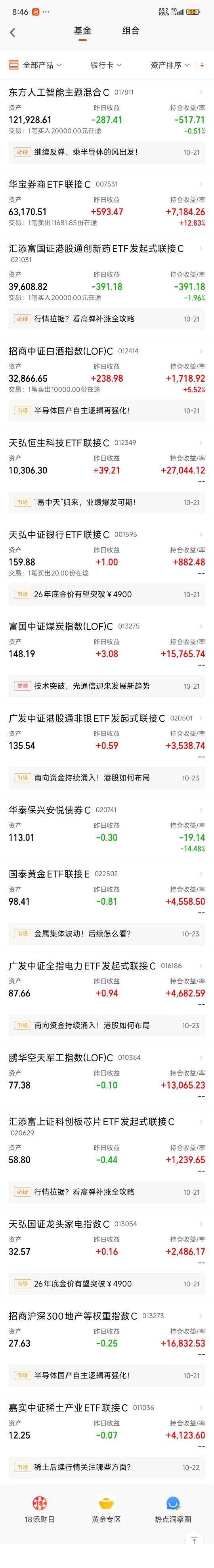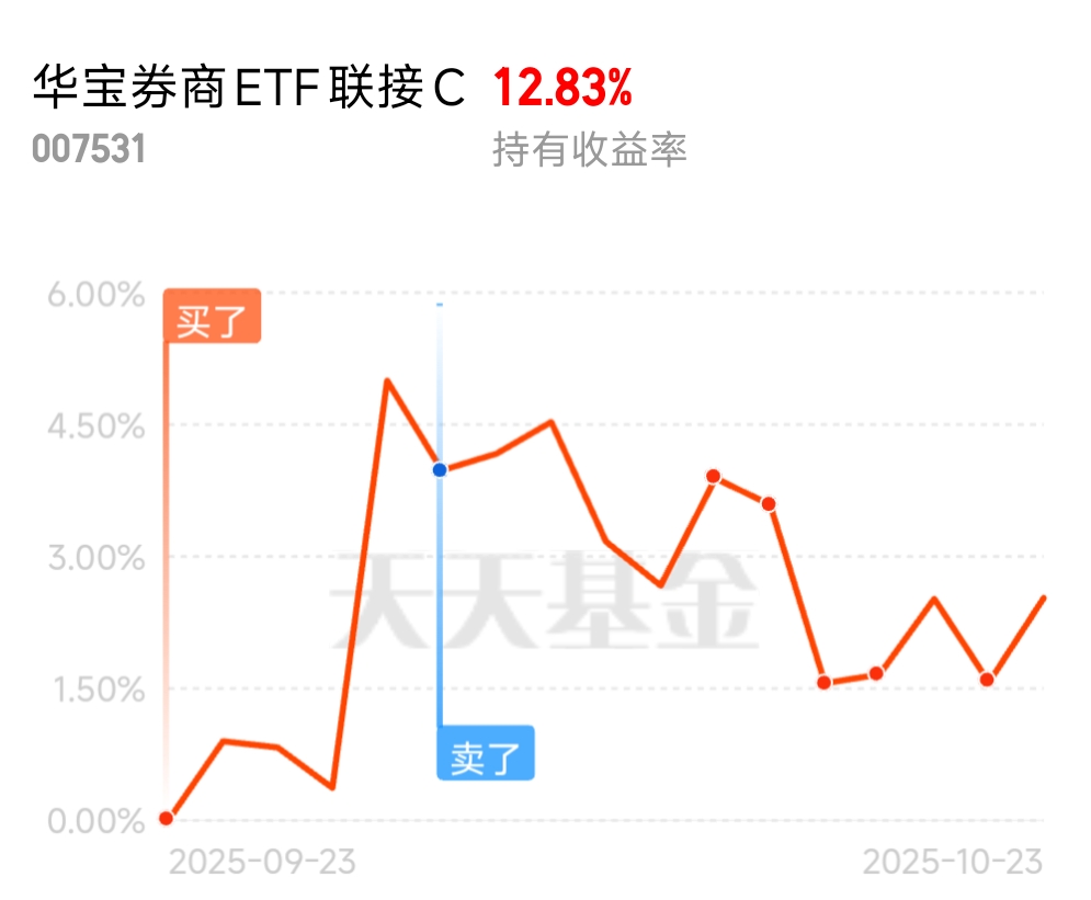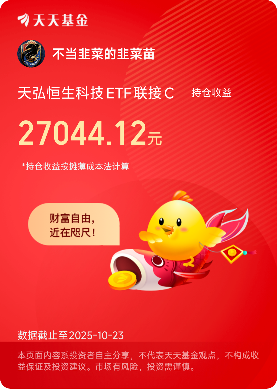 #高盛看多A股:慢牛正形成 还有约30%上涨空间# #党的四中全会审议通过“十五五”规划建议# #科技热点摊开业啦# #15连阳!农行总市值逼近2.9万亿# #黄金创12年来最大单日跌幅!什么信号# #亚太股市杀跌 市场开启避险模式?# #OpenAI联手博通!AI产业链怎么投?# #晒实盘# #晒晒我的神操作# #晒操作# $汇添富国证港股通创新药ETF发起式联接C$ $汇添富国证港股通创新药ETF$$华泰柏瑞港股通医疗精选混合发起式C$ $东方人工智能主题混合C$ $华泰保兴安悦债券C$ $金信消费升级股票C$ $广发中证港股通非银ETF发起式联接C$ $中欧数字经济混合发起C$ $天弘中证银行ETF联接C$ $天弘中证银行ETF联接C$ $国泰黄金ETF联接E$ $永赢中证沪深港黄金产业股票ETF发起联接C$ $广发纳斯达克100ETF联接人民币(QDII)C$ $方正富邦中证保险C$ $汇添富上证科创板芯片ETF发起式联接C$ $嘉实中证稀土产业ETF联接C$ $汇添富上证综合指数C$ $华安北证50成份指数发起式C$ $鹏华空天军工指数(LOF)C$ $招商中证白酒指数(LOF)C$ $广发中证全指电力ETF发起式联接C$ $天弘国证龙头家电指数C$ $华夏科创50ETF联接C$ $华宝券商ETF联接C$ $富国中证煤炭指数(LOF)C$ $天弘恒生科技ETF联接C$ $招商沪深300地产等权重指数C$