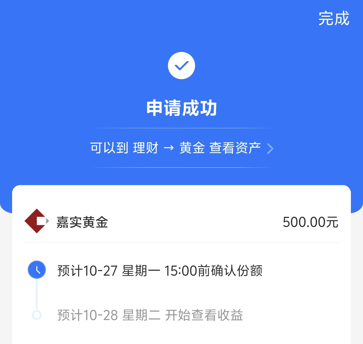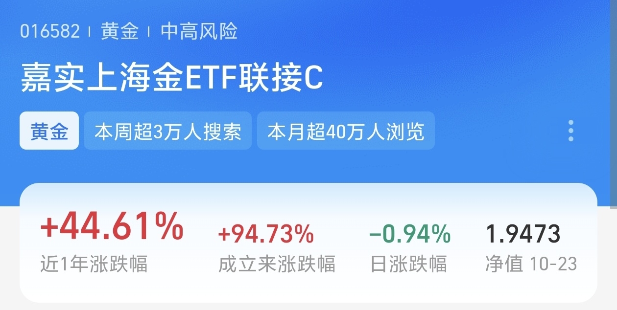 今天我也是提前布局加仓了$嘉实上海金ETF发起联接C$ +500元,基金近期表现的也是非常的优秀。近一个月上涨了9.82%,近一年的收益率高达44.61%,盈利能力强。各阶段业绩在同类基金排名领先,收益率远超同类平均。在目前降息预期+避险需求的双轮驱动下,黄金增长潜力大。基金凭借着优秀的回撤控制能力和较高的投资性价比,在市场中表现的也是能涨抗跌。随着大量的资金顺周期流入黄金,为市场提供了增量资金。并且多家机构对黄金未来走势乐观态度,长期持有,投资回报率高,期待后期收益。