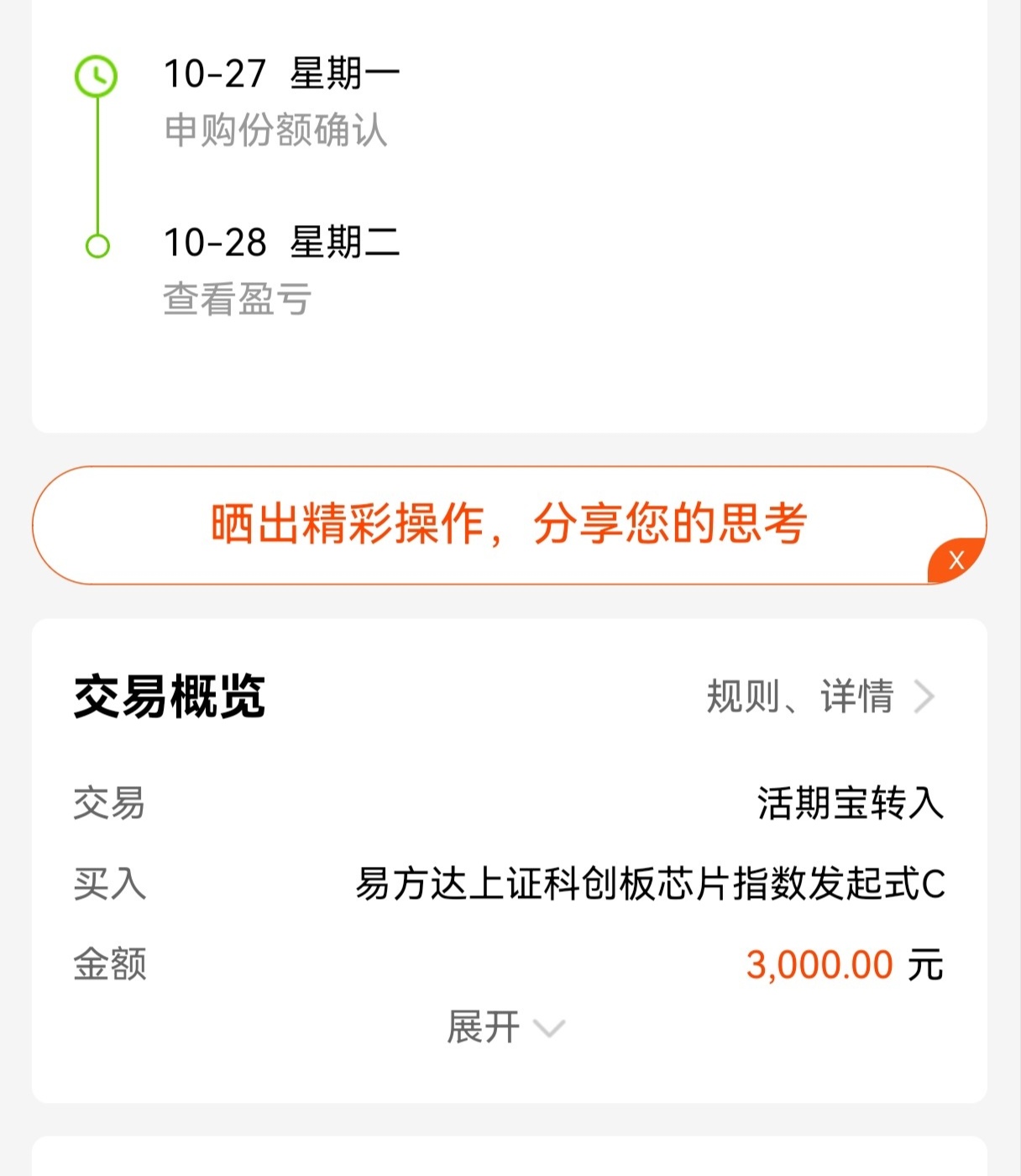 今天股市高开,科创芯片板块涨幅较大。我打算继续加仓各阶段表现突出的基金$易方达上证科创板芯片指数发起式C(OTCFUND|020671)$提升收益。该基金近期及中期涨幅均明显领先于同类产品。其重点布局科创板芯片龙头股,紧密跟踪行业指数,能有效捕捉板块上涨红利。当前市场情绪助推下,有望获得超额收益,适合短线配置或逢低布局。