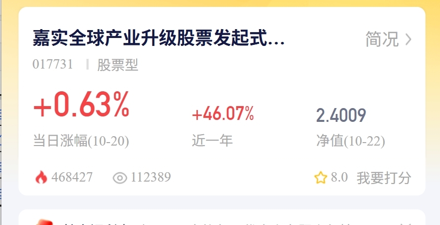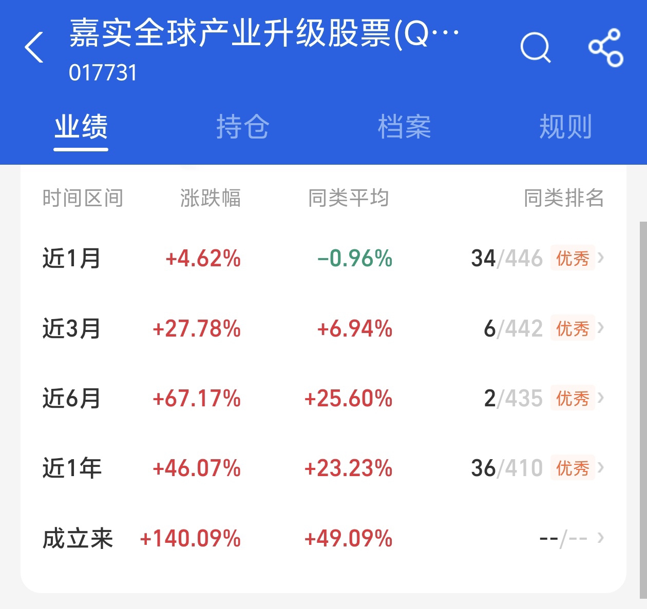 $嘉实全球产业升级股票发起式(QDII)C$ 到目前为止估值上涨了0.63%,今晚吃肉。基金近期表现的也是非常的优秀。近三个月上涨了27.78%,近六个月的收益率高达67.17%,盈利能力强。基金全球化布局了英伟达、美光科技、高通、博通、中芯国际等技龙头,上涨弹性大,爆发力强。随着科技企业在技术创新和业务拓展能力持续推进,盈利能力也逐步的提升,将迎来新一轮的上涨。长期持,有投资回报率高,期待后期收益。