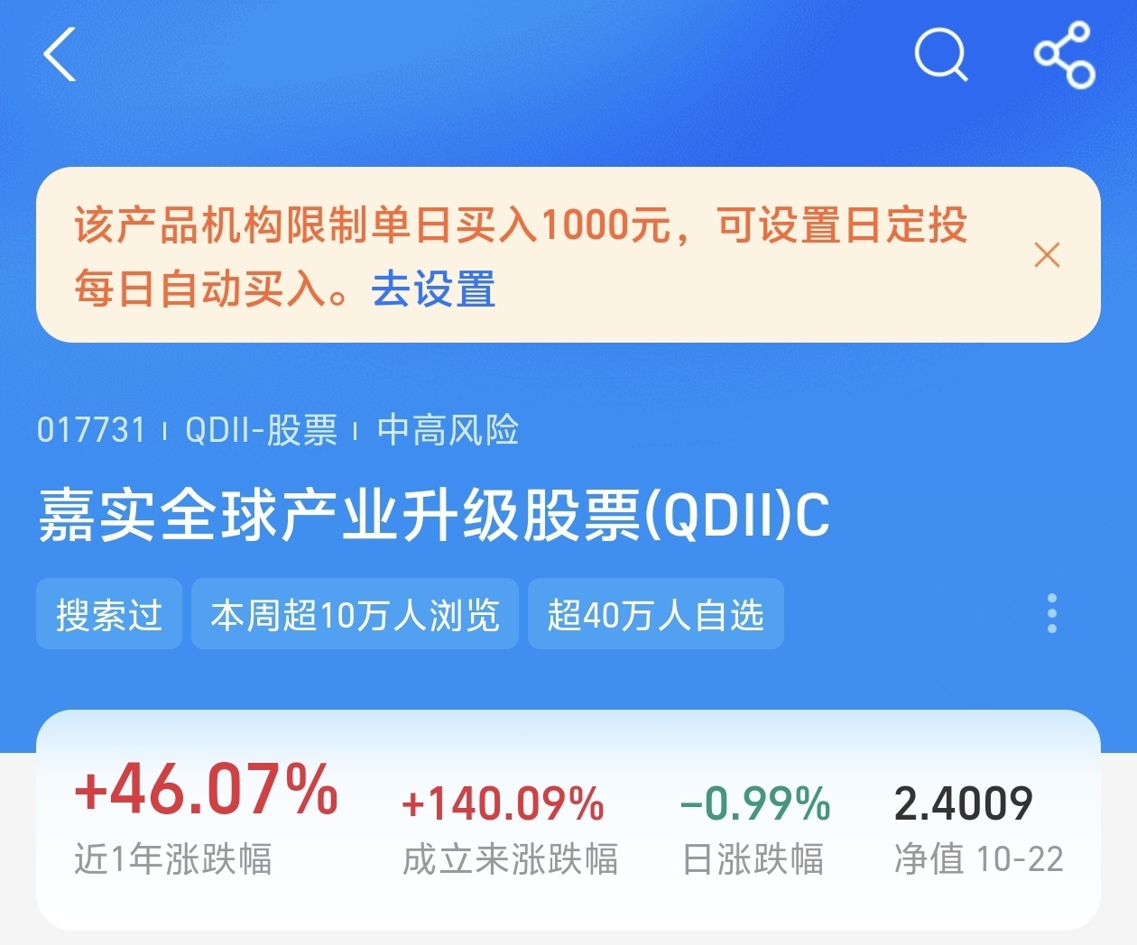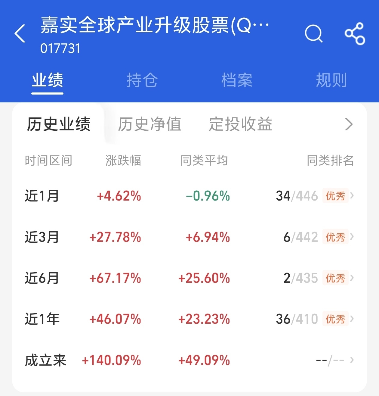 最近的行情也在逐步的上涨中,表现的也是非常的不错,收益率高。$嘉实全球产业升级股