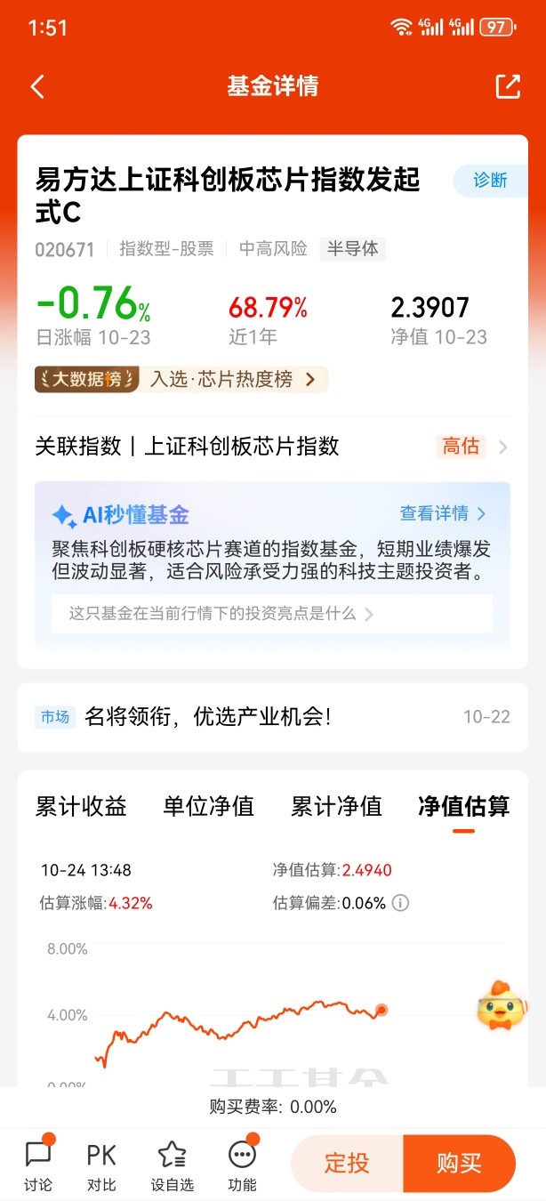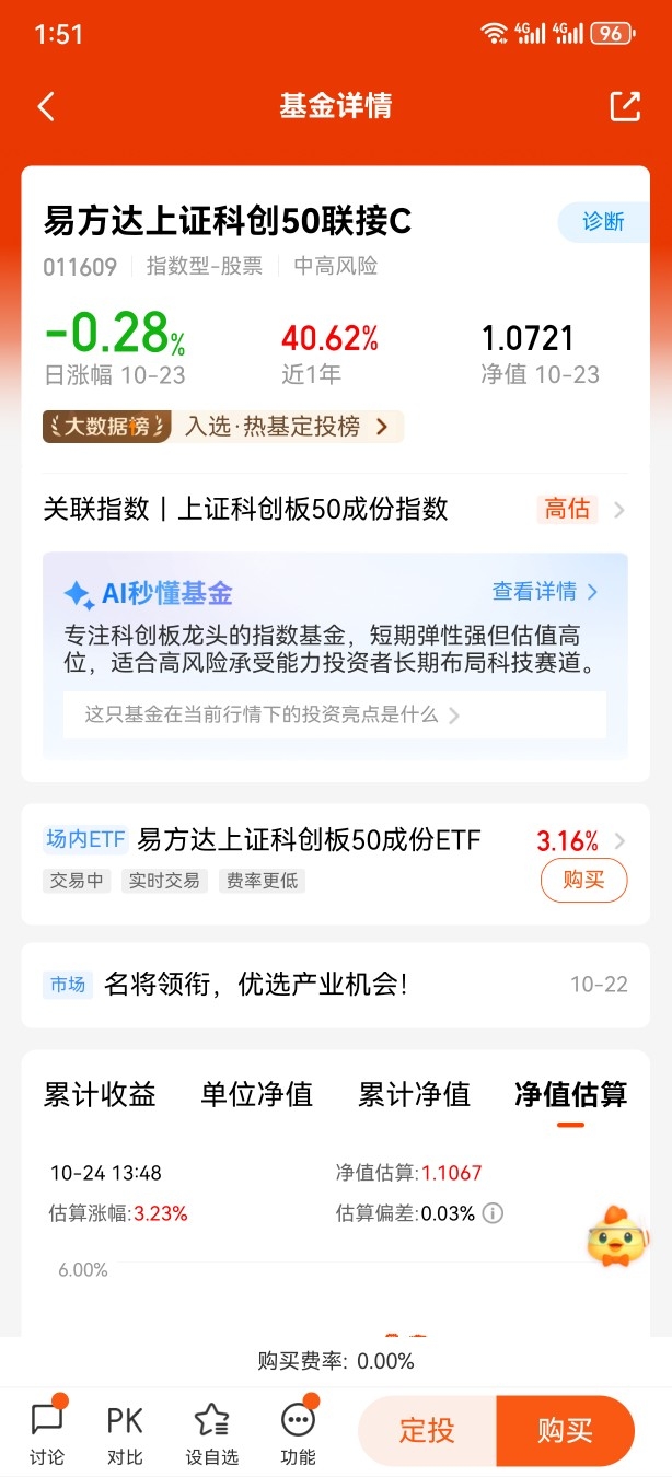 我一直定投易方达上证科创50联接A,仓位最高时达到50%,前一阵子减仓之后,目前科创50的持仓大概12%。我现在仍然看好科创50,如果回调我会果断加仓。