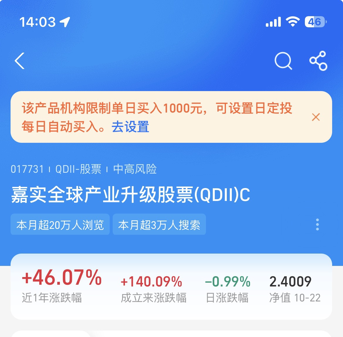 昨晚纳指又吃肉了呀,收盘涨0.88%,这支$嘉实全球产业升级股票(QDII)C$