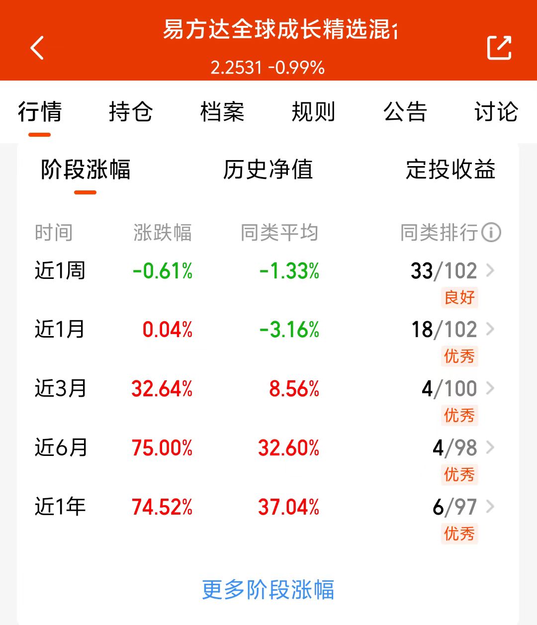 全球科技板块表现不错,美股昨夜涨起来了,大A和港股今天也涨了不少,降息周期开启,全球科技板块有望受益,现在单看一个市场容易踏空,我准备加仓易方达全球成长精选混合C,持仓可投全球科技板块,美股、港股和A股都能投,近六个月涨了75%,我打算分批加仓了!