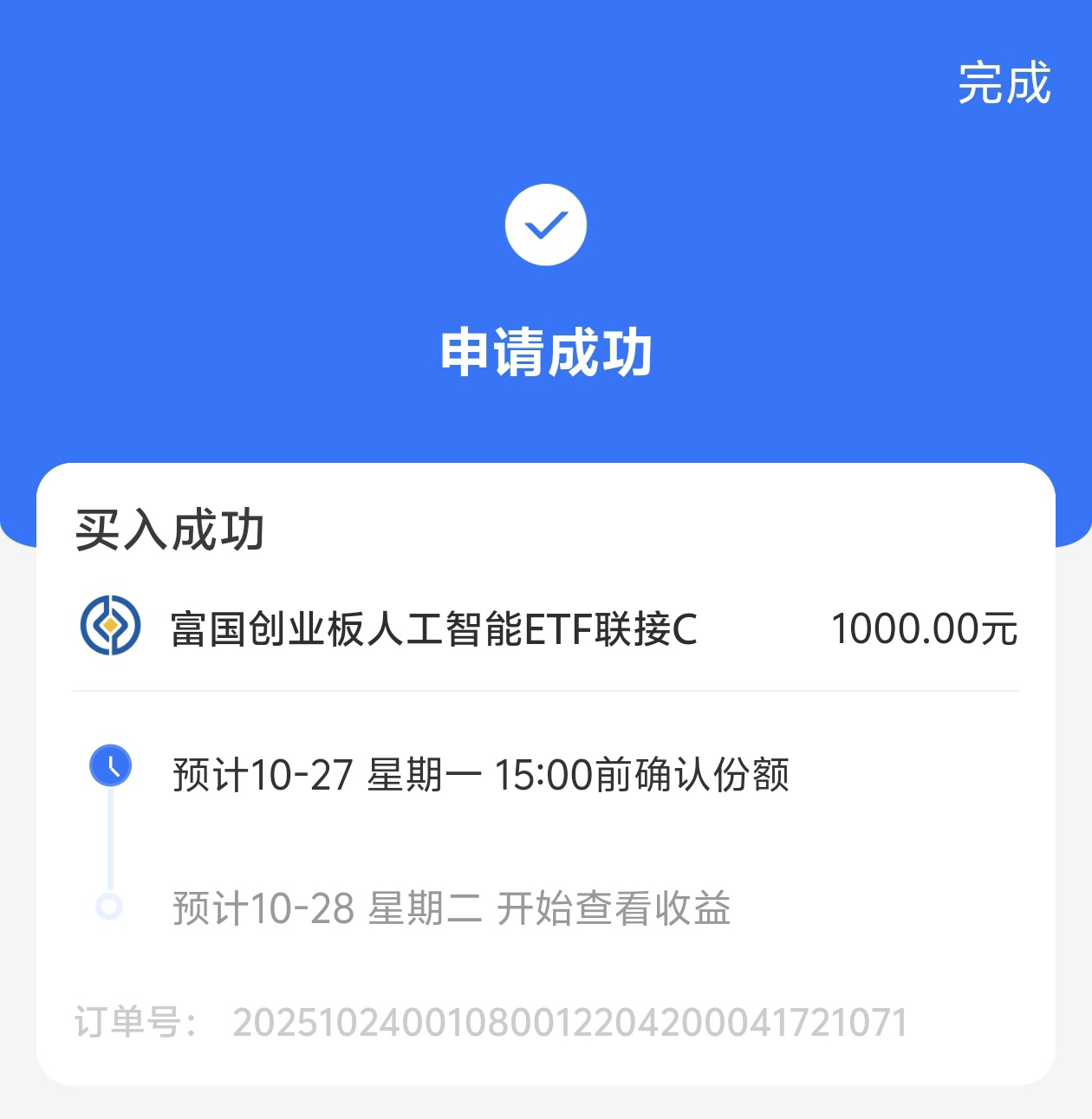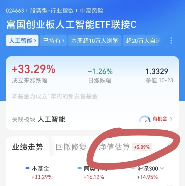 今天我也是抓紧上车了$富国创业板人工智能ETF发起式联接C$ +1000元,目前的估值上涨了5.03%,盈利能力强,基金历史业绩是非常的优秀,近三个月上涨了33.62%,收益率高。目前人工智能板块在政策支持+基本面改善的双轮驱动下,将迎来新一轮的上涨。目前AI技术不断的取得突破,大模型的发展,人工智能应用场景不断的拓展,未来增长潜力大。长期持有,投资回报率高,坐等吃肉!