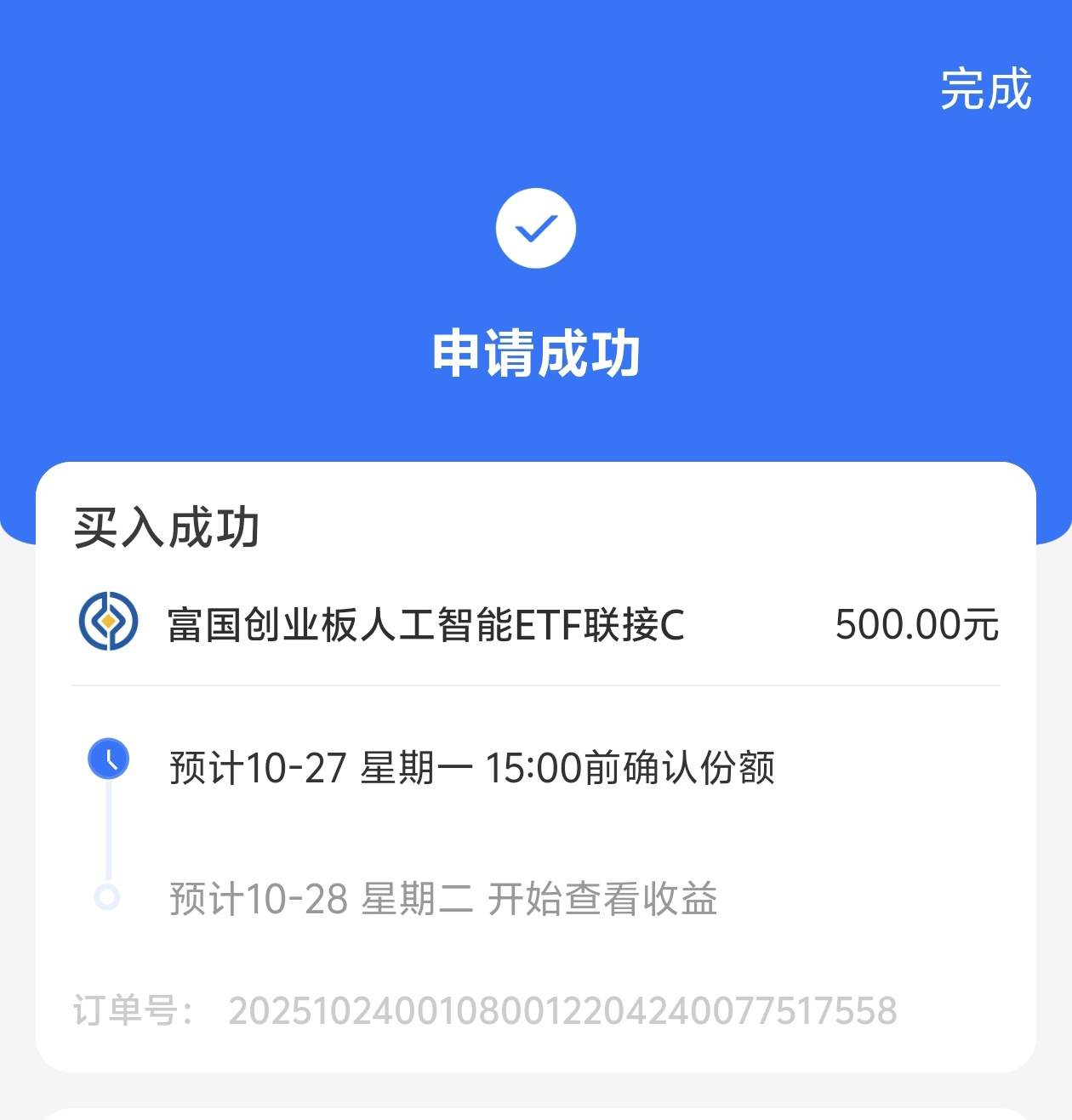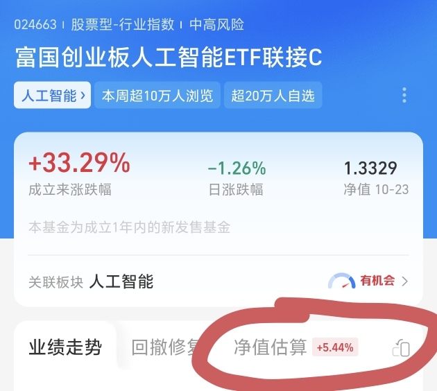 $富国创业板人工智能ETF发起式联接C$ +5000元,目前的估值上涨了5.44%,今晚吃肉。基金布局算力、CPO板块,基本面扎实,预计还有一波上涨。趁目前还没完全的涨上去,我也是抓紧布局。随着数字化转型加速,各行业对人工智能需求增长。AI技术不断突破,人工智能也被列入国家战略,为行业发展提供了坚定政策支持。随着市场情绪的高涨,大量的资金顺周期流入人工智能板块将迎来新一轮的上涨,长期持有,投资回报率高,期待后期收益。