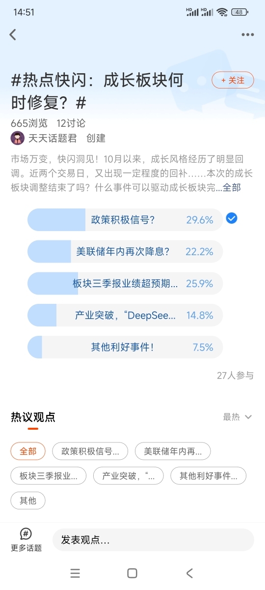 我在#热点快闪:成长板块何时修复?# 选择了“政策积极信号?”,成长板块的核心特征在于高研发投入、长盈利周期,其估值逻辑高度依赖对未来行业空间与企业成长性的预期。当经济面临下行压力或市场情绪低迷时,投资者对成长板块的盈利确定性、技术突破节奏、行业政策导向易产生担忧,进而形成“不确定性折价”,导致资金避险撤离。
