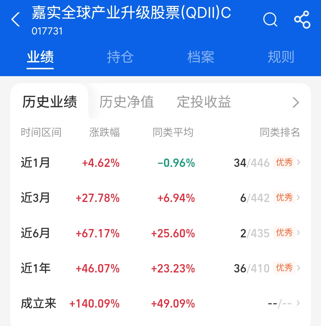 $嘉实全球产业升级股票发起式(QDII)C$ 全球产业升级表现太亮眼,近半年涨了67.17%,实力摆在这。既然全球科技和产业升级的大方向不变,有肉吃,继续看好。