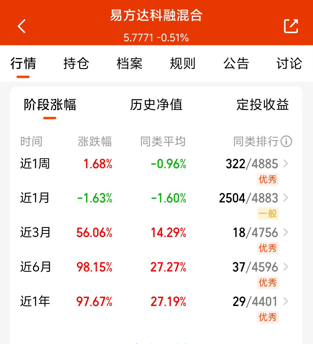 大盘今天太给力了,继续上涨,三大指数持续拉升,今天整体涨了不少,近期市场波动比较大,成长行情轮动很快,易方达科融混合持仓科技、新能源、军工轮动配置,持仓比较均衡一些,近六个月涨了98.15%,回撤也控制的不错,看好经理的调仓能力,我准备分批上车了!